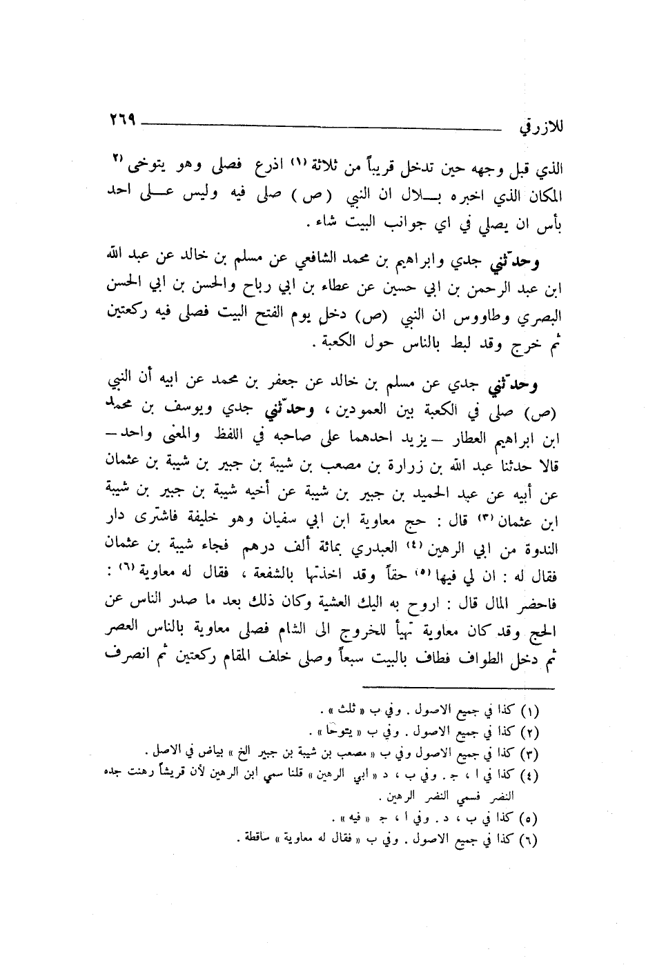 وَحَدَّثَنِي جَدِّي، وَيُوسُفُ بْنُ مُحَمَّدِ بْنِ إِبْرَاهِيمَ الْعَطَّارُ - يَزِيدُ أَحَدُهُمَا عَلَى صَاحِبِهِ فِي اللَّفْظِ، وَالْمَعْنَى وَاحِدٌ - قَالَا: حَدَّثَنَا عَبْدُ اللَّهِ بْنُ زُرَارَةَ بْنِ مُصْعَبِ بْنِ شَيْبَةَ بْنِ جُبَيْرِ بْنِ شَيْبَةَ بْنِ عُثْمَانَ، عَنْ أَبِيهِ، عَنْ عَبْدِ الْحَمِيدِ بْنِ جُبَيْرِ بْنِ شَيْبَةَ، عَنْ أَخِيهِ شَيْبَةَ بْنِ جُبَيْرِ بْنِ شَيْبَةَ بْنِ عُثْمَانَ قَالَ: " حَجَّ مُعَاوِيَةُ بْنُ أَبِي سُفْيَانَ وَهُوَ خَلِيفَةٌ، فَاشْتَرَى دَارَ النَّدْوَةِ مِنْ أَبِي الرَّهِينِ الْعَبْدَرِيِّ بِمِائَةِ أَلْفِ دِرْهَمٍ، فَجَاءَ شَيْبَةُ بْنُ عُثْمَانَ، فَقَالَ لَهُ: إِنَّ لِي فِيهَا حَقًّا، وَقَدْ أَخَذْتُهَا بِالشُّفْعَةِ. فَقَالَ لَهُ مُعَاوِيَةُ: فَأَحْضِرِ الْمَالَ. قَالَ: أَرُوحُ بِهِ إِلَيْكَ الْعَشِيَّةَ. وَكَانَ ذَلِكَ بَعْدَ مَا صَدَرَ النَّاسُ عَنِ الْحَجِّ، وَقَدْ كَانَ مُعَاوِيَةُ تَهَيَّأَ لِلْخُرُوجِ إِلَى الشَّامِ، فَصَلَّى مُعَاوِيَةُ بِالنَّاسِ الْعَصْرَ، ثُمَّ دَخَلَ الطَّوَافَ فَطَافَ بِالْبَيْتِ سَبْعًا، وَصَلَّى خَلْفَ الْمَقَامِ رَكْعَتَيْنِ، ثُمَّ انْصَرَفَ