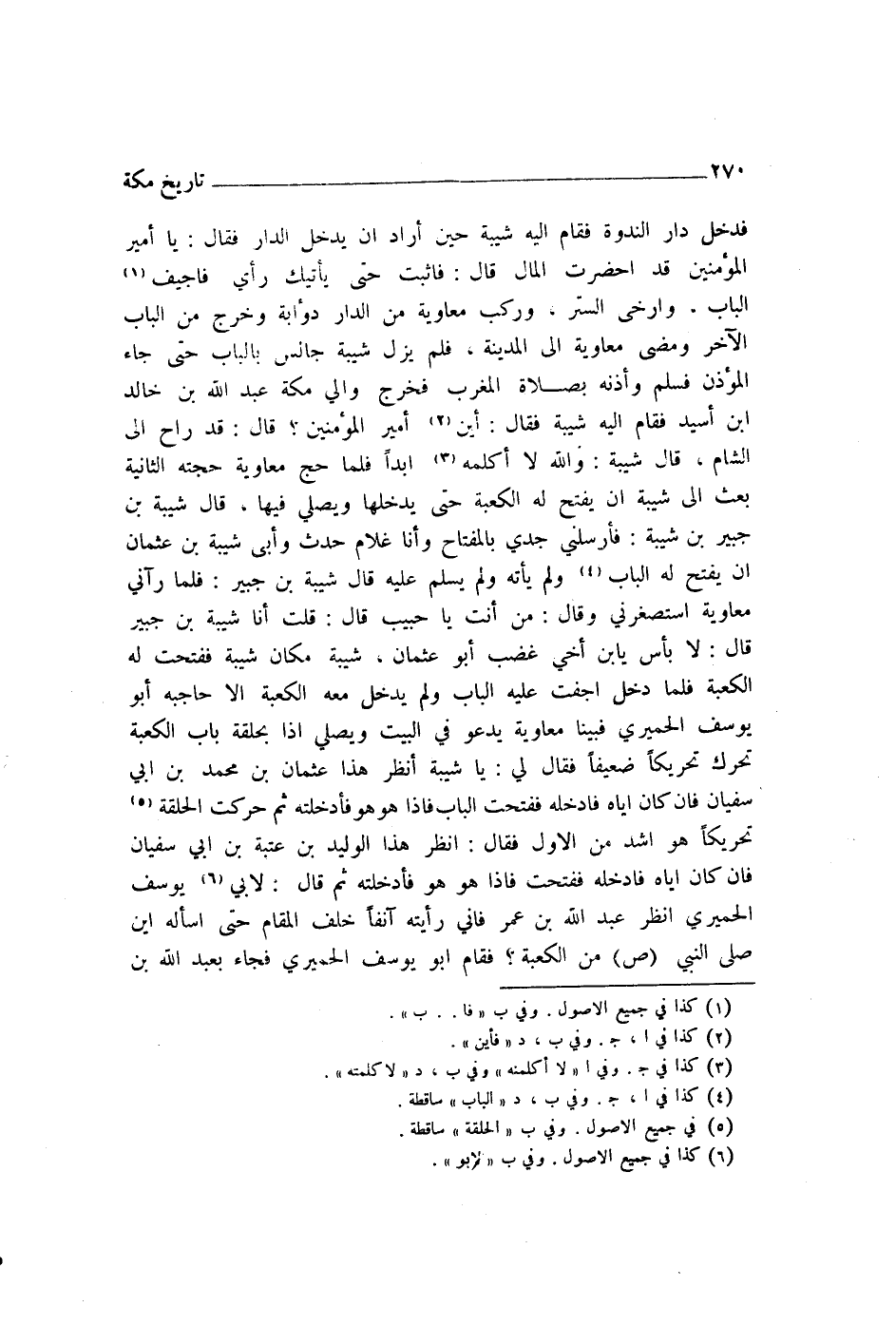 فَدَخَلَ دَارَ النَّدْوَةِ، فَقَامَ إِلَيْهِ شَيْبَةُ حِينَ أَرَادَ أَنْ يَدْخُلَ الدَّارَ، فَقَالَ: يَا أَمِيرَ الْمُؤْمِنِينَ، قَدْ أَحْضَرْتُ الْمَالَ. قَالَ: فَاثْبُتْ حَتَّى يَأْتِيَكَ رَأْيِ. فَأُجِيفَ الْبَابُ، وَأُرْخِيَ السِّتْرُ، وَرَكِبَ مُعَاوِيَةُ مِنَ الدَّارِ دَابَّةً وَخَرَجَ مِنَ الْبَابِ الْآخَرِ، وَمَضَى مُعَاوِيَةُ إِلَى الْمَدِينَةِ، فَلَمْ يَزَلْ شَيْبَةُ جَالِسًا بِالْبَابِ حَتَّى جَاءَ الْمُؤَذِّنُ، فَسَلَّمَ وَآذَنَهُ بِصَلَاةِ الْمَغْرِبِ، فَخَرَجَ وَالِي مَكَّةَ عَبْدُ اللَّهِ بْنُ خَالِدِ بْنِ أَسِيدٍ، فَقَامَ إِلَيْهِ شَيْبَةُ فَقَالَ: أَيْنَ أَمِيرُ الْمُؤْمِنِينَ؟ قَالَ: قَدْ رَاحَ إِلَى الشَّامِ. قَالَ شَيْبَةُ: وَاللَّهِ لَا أُكَلِّمُهُ أَبَدًا. فَلَمَّا حَجَّ مُعَاوِيَةُ حَجَّتَهُ الثَّانِيَةَ بَعَثَ إِلَى شَيْبَةَ أَنْ يَفْتَحَ لَهُ الْكَعْبَةَ حَتَّى يَدْخُلَهَا وَيُصَلِّيَ فِيهَا. قَالَ شَيْبَةُ بْنُ جُبَيْرِ بْنِ شَيْبَةَ: فَأَرْسَلَنِي جَدِّي بِالْمِفْتَاحِ وَأَنَا غُلَامٌ حَدَثٌ، وَأَبَى شَيْبَةُ بْنُ عُثْمَانَ أَنْ يَفْتَحَ لَهُ الْبَابَ، وَلَمْ يَأْتِهِ وَلَمْ يُسَلِّمْ عَلَيْهِ. قَالَ شَيْبَةُ بْنُ جُبَيْرٍ: فَلَمَّا رَآنِي مُعَاوِيَةُ اسْتَصْغَرَنِي، وَقَالَ: مَنْ أَنْتَ يَا حَبِيبُ؟ قَالَ: قُلْتُ: أَنَا شَيْبَةُ بْنُ جُبَيْرٍ. قَالَ: لَا بَأْسَ يَا ابْنَ أَخِي، غَضِبَ أَبُو عُثْمَانَ شَيْبَةُ مَكَانَ شَيْبَةَ. فَفَتَحْتُ لَهُ الْكَعْبَةَ، فَلَمَّا دَخَلَ أَجَفْتُ عَلَيْهِ الْبَابَ، وَلَمْ يَدْخُلْ مَعَهُ الْكَعْبَةَ إِلَّا حَاجِبُهُ أَبُو يُوسُفَ الْحِمْيَرِيُّ، فَبَيْنَا مُعَاوِيَةُ يَدْعُو فِي الْبَيْتِ وَيُصَلِّي إِذَا بِحَلْقَةِ بَابِ الْكَعْبَةِ تُحَرَّكُ تَحْرِيكًا ضَعِيفًا، فَقَالَ لِي: يَا شَيْبَةُ، انْظُرْ، هَذَا عُثْمَانُ بْنُ مُحَمَّدِ بْنِ أَبِي سُفْيَانَ، فَإِنْ كَانَ إِيَّاهُ فَأَدْخِلْهُ. فَفَتَحْتُ الْبَابَ، فَإِذَا هُوَ هُوَ، فَأَدْخَلْتُهُ، ثُمَّ حَرَّكْتُ الْحَلْقَةَ تَحْرِيكًا هُوَ أَشَدُّ مِنَ الْأَوَّلِ فَقَالَ: انْظُرْ هَذَا الْوَلِيدُ بْنُ عُتْبَةَ بْنِ أَبِي سُفْيَانَ فَإِنْ كَانَ إِيَّاهُ فَأَدْخِلْهُ فَفَتَحْتُ فَإِذَا هُوَ هُوَ فَأَدْخَلْتُهُ ثُمَّ قَالَ: لِأَبِي يُوسُفَ الْحِمْيَرِيِّ: انْظُرْ عَبْدَ اللَّهِ بْنَ عُمَرَ فَإِنِّي رَأَيْتُهُ آنِفًا خَلْفَ الْمَقَامِ حَتَّى أَسْأَلَهُ أَيْنَ صَلَّى النَّبِيُّ صَلَّى اللهُ عَلَيْهِ وَسَلَّمَ مِنَ الْكَعْبَةِ؟ فَقَامَ أَبُو يُوسُفَ الْحِمْيَرِيُّ فَجَاءَ بِعَبْدِ اللَّهِ بْنِ