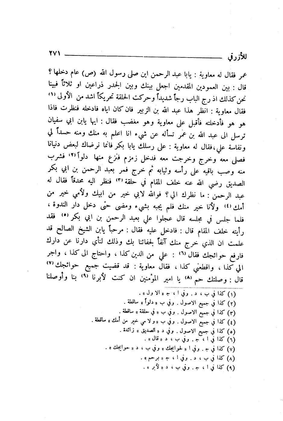 عُمَرَ فَقَالَ لَهُ مُعَاوِيَةُ: يَا أَبَا عَبْدِ الرَّحْمَنِ، §أَيْنَ صَلَّى رَسُولُ اللَّهِ صَلَّى اللهُ عَلَيْهِ وَسَلَّمَ عَامَ دَخَلَهَا؟ قَالَ: بَيْنَ الْعَمُودَيْنِ الْمُقَدَّمَيْنِ اجْعَلْ بَيْنَكَ وَبَيْنَ الْجَدْرِ ذِرَاعَيْنِ أَوْ ثَلَاثًا فَبَيْنَا نَحْنُ كَذَلِكَ إِذْ رُجَّ الْبَابُ رَجًّا شَدِيدًا وَحُرِّكَتِ الْحَلْقَةُ تَحْرِيكًا أَشَدَّ مِنَ الْأُولَى فَقَالَ مُعَاوِيَةُ: انْظُرْ هَذَا عَبْدُ اللَّهِ بْنُ الزُّبَيْرِ فَإِنْ كَانَ إِيَّاهُ فَأَدْخِلْهُ فَنَظَرْتُ فَإِذَا هُوَ هُوَ فَأَدْخَلْتُهُ فَأَقْبَلَ عَلَى مُعَاوِيَةَ وَهُوَ مُغْضَبٌ فَقَالَ: إِيهًا يَا ابْنَ أَبِي سُفْيَانَ تُرْسِلُ إِلَى عَبْدِ اللَّهِ بْنِ عُمَرَ تَسْأَلُهُ عَنْ شَيْءٍ أَنَا أَعْلَمُ بِهِ مِنْكَ وَمِنْهُ حَسَدًا لِي وَنِفَاسَةً عَلَيَّ، فَقَالَ لَهُ مُعَاوِيَةُ: عَلَى رِسْلِكَ يَا أَبَا بَكْرٍ فَإِنَّمَا نَرْضَاكَ لِبَعْضِ دُنْيَانَا فَصَلَّى مَعَهُ وَخَرَجَ وَخَرَجْتُ مَعَهُ فَدَخَلَ زَمْزَمَ فَنَزَعَ مِنْهَا دَلْوًا فَشَرِبَ مِنْهُ وَصَبَّ بَاقِيَهُ عَلَى رَأْسِهِ وَثِيَابِهِ ثُمَّ خَرَجَ فَمَرَّ بِعَبْدِ الرَّحْمَنِ بْنِ أَبِي بَكْرٍ الصِّدِّيقِ رَضِيَ اللَّهُ عَنْهُ خَلْفَ الْمَقَامِ فِي حَلْقَةٍ فَنَظَرَ إِلَيْهِ مُحَدِّقًا فَقَالَ لَهُ عَبْدُ الرَّحْمَنِ: مَا نَظَرُكَ إِلَيَّ؟ فَوَاللَّهِ لَأَبِي خَيْرٌ مِنْ أَبِيكَ وَلَأُمِّي خَيْرٌ مِنْ أُمِّكَ وَلَأَنَا خَيْرٌ مِنْكَ فَلَمْ يُجِبْهُ بِشَيْءٍ وَمَضَى حَتَّى دَخَلَ دَارَ النَّدْوَةِ، فَلَمَّا جَلَسَ فِي مَجْلِسِهِ قَالَ: عَجِّلُوا عَلَيَّ بِعَبْدِ الرَّحْمَنِ بْنِ أَبِي بَكْرٍ فَقَدْ رَأَيْتُهُ خَلْفَ الْمَقَامِ قَالَ: فَأُدْخِلَ عَلَيْهِ فَقَالَ: مَرْحَبًا يَا ابْنَ الشَّيْخِ الصَّالِحِ قَدْ عَلِمْتُ أَنَّ الَّذِيَ خَرَجَ مِنْكَ آنِفًا لِجَفَائِنَا بِكَ وَذَلِكَ لِنَأْيِ دَارِنَا عَنْ دَارِكَ فَارْفَعْ حَوَائِجَكَ فَقَالَ: عَلَيَّ مِنَ الدَّيْنِ كَذَا، واحتاج إلى كذا وَأَجْرِ إِلَيَّ كَذَا، وَأَقْطِعْنِي كَذَا، فَقَالَ مُعَاوِيَةُ: قَدْ قَضَيْتُ جَمِيعَ حَوَائِجِكَ قَالَ: وَصَلَتْكَ رَحِمٌ يَا أَمِيرَ الْمُؤْمِنِينَ إِنْ كُنْتَ لَأَبَرَّنَا بِنَا وَأَوْصَلَنَا