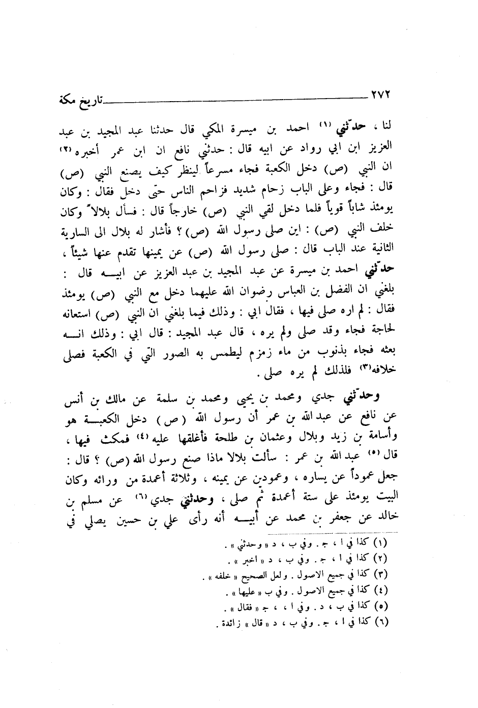 حَدَّثَنِي أَحْمَدُ بْنُ مَيْسَرَةَ الْمَكِّيُّ، قَالَ: حَدَّثَنِا عَبْدُ الْمَجِيدِ بْنُ عَبْدِ الْعَزِيزِ بْنِ أَبِي رَوَّادٍ، عَنْ أَبِيهِ، قَالَ: حَدَّثَنِي نَافِعٌ، أَنَّ ابْنَ عُمَرَ، أَخْبَرَهُ أَنَّ النَّبِيَّ صَلَّى اللهُ عَلَيْهِ وَسَلَّمَ «دَخَلَ الْكَعْبَةَ» فَجَاءَ مُسْرِعًا لَيَنْظُرُ كَيْفَ يَصْنَعُ النَّبِيُّ صَلَّى اللهُ عَلَيْهِ وَسَلَّمَ قَالَ: فَجَاءَ وَعَلَى الْبَابِ زِحَامٌ شَدِيدٌ فَزَاحَمَ النَّاسَ حَتَّى دَخَلَ فَقَالَ: وَكَانَ يَوْمَئِذٍ شَابًّا قَوِيًّا فَلَمَّا دَخَلَ لَقِيَ النَّبِيَّ صَلَّى اللهُ عَلَيْهِ وَسَلَّمَ خَارِجًا قَالَ: فَسَأَلَ بِلَالًا وَكَانَ خَلْفَ النَّبِيِّ صَلَّى اللهُ عَلَيْهِ وَسَلَّمَ: §أَيْنَ صَلَّى رَسُولُ اللَّهِ صَلَّى اللهُ عَلَيْهِ وَسَلَّمَ؟ فَأَشَارَ لَهُ بِلَالٌ إِلَى السَّارِيَةِ الثَّانِيَةِ عِنْدَ الْبَابِ قَالَ: «صَلَّى رَسُولُ اللَّهِ صَلَّى اللهُ عَلَيْهِ وَسَلَّمَ عَنْ يَمِينِهَا تَقَدَّمَ عَنْهَا شَيْئًا»