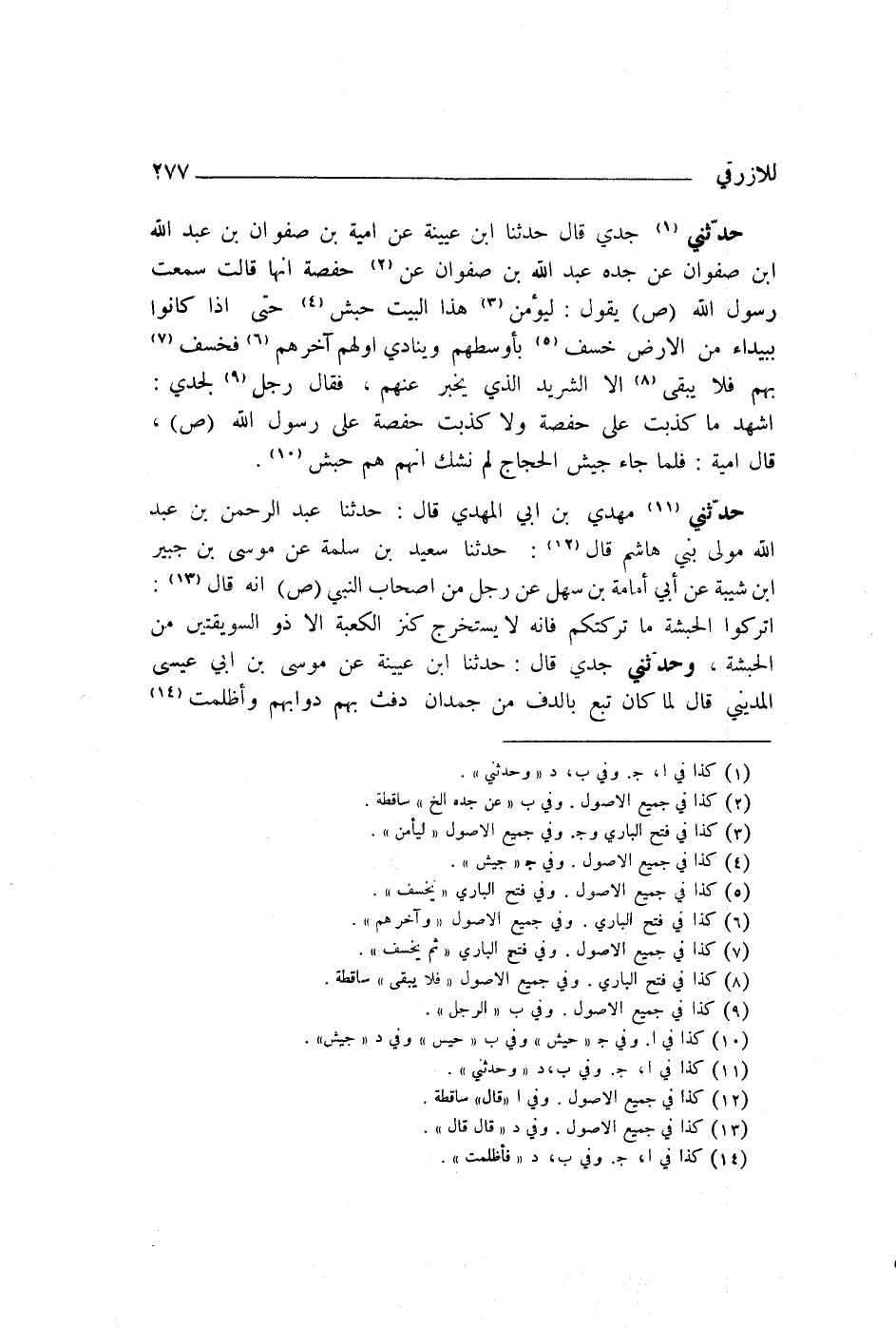 حَدَّثَنِي مَهْدِيُّ بْنُ أَبِي الْمَهْدِيِّ قَالَ: حَدَّثَنَا عَبْدُ الرَّحْمَنِ بْنُ عَبْدِ اللَّهِ مَوْلَى بَنِي هَاشِمٍ قَالَ: حَدَّثَنَا سَعِيدُ بْنُ سَلَمَةَ عَنْ مُوسَى بْنِ جُبَيْرِ بْنِ شَيْبَةَ، عَنْ أَبِي أُمَامَةَ بْنِ سَهْلٍ، عَنْ رَجُلٍ مِنْ أَصْحَابِ النَّبِيِّ صَلَّى اللهُ عَلَيْهِ وَسَلَّمَ أَنَّهُ قَالَ: «§اتْرُكُوا الْحَبَشَةَ مَا تَرَكَتْكُمْ فَإِنَّهُ لَا يَسْتَخْرِجُ كَنْزَ الْكَعْبَةِ إِلَّا ذُو السُّوَيْقَتَيْنِ مِنَ الْحَبَشَةِ»