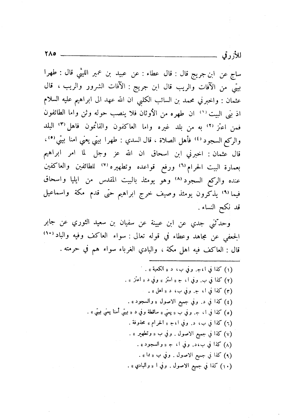 وَحَدَّثَنِي جَدِّي عَنِ ابْنِ عُيَيْنَةَ، عَنْ سُفْيَانَ بْنِ سَعِيدٍ الثَّوْرِيِّ، عَنْ جَابِرٍ الْجُعْفِيِّ، عَنْ مُجَاهِدٍ، وَعَطَاءٍ فِي قَوْلِهِ تَعَالَى: {سَوَاءً الْعَاكِفُ فِيهِ وَالْبَادِ} [الحج: 25] قَالَ: " {§الْعَاكِفُ فِيهِ} [الحج: 25] أَهْلُ مَكَّةَ {وَالْبَادِ} [الحج: 25] الْغُرَبَاءُ سَوَاءٌ هُمْ فِي حُرْمَتِهِ "