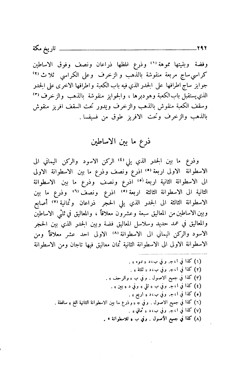 §ذَرْعُ مَا بَيْنَ الْأَسَاطِينِ وَذَرْعُ مَا بَيْنَ الْجَدْرِ الَّذِي يَلِي الرُّكْنَ الْأَسْوَدَ وَالرُّكْنَ الْيَمَانِيَّ إِلَى الْأُسْطُوَانَةِ الْأُولَى أَرْبَعَةُ أَذْرُعٍ وَنِصْفٌ، وَذَرْعُ مَا بَيْنَ الْأُسْطُوَانَةِ الْأُولَى إِلَى الْأُسْطُوَانَةِ الثَّانِيَةِ أَرْبَعَةُ أَذْرُعٍ وَنِصْفٌ، وَذَرْعُ مَا بَيْنَ الْأُسْطُوَانَةِ الثَّانِيَةِ إِلَى الْأُسْطُوَانَةِ الثَّالِثَةِ أَرْبَعَةُ أَذْرُعٍ وَنِصْفٍ وَذَرْعُ مَا بَيْنَ الْأُسْطُوَانَةِ الثَّالِثَةِ إِلَى الْجَدْرِ الَّذِي يَلِي الْحِجْرَ ذِرَاعَانِ وَثَمَانِيَةُ أَصَابِعَ وَبَيَنَ الْأَسَاطِينِ مِنِ الْمَعَالِيقِ سَبْعَةٌ وَعِشْرُونَ مِعْلَاقًا، وَالْمَعَالِيقُ فِي ثُلُثَيِ الْأَسَاطِينِ وَالْمَعَالِيقُ فِي عُمُدِ حَدِيدٍ وَسَلَاسِلُ الْمَعَالِيقِ فِضَّةٌ وَبَيْنَ الْجَدْرِ الَّذِي بَيْنَ الْحَجَرِ الْأَسْوَدِ وَالرُّكْنِ الْيَمَانِيِّ إِلَى الْأُسْطُوَانَةِ الْأُولَى أَحَدَ عَشَرَ مِعْلَاقًا وَمِنَ الْأُسْطُوَانَةِ الْأُولَى إِلَى الْأُسْطُوَانَةِ الثَّانِيَةِ ثَمَانِ مَعَالِيقَ فِيهَا تَاجَانِ وَمِنَ الْأُسْطُوَانَةِ