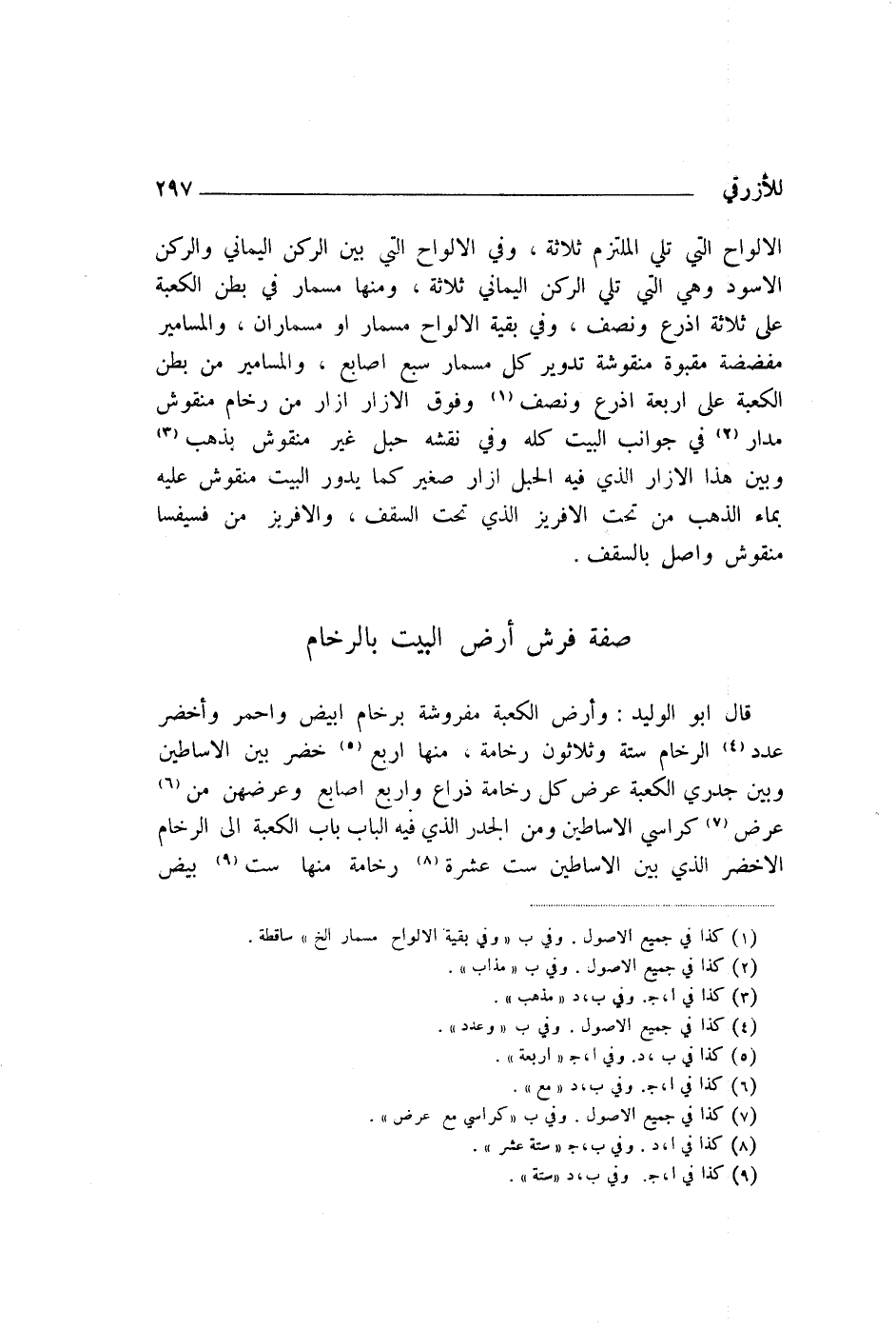 §صِفَةُ فَرْشِ أَرْضِ الْبَيْتِ بِالرُّخَامِ قَالَ أَبُو الْوَلِيدِ: وَأَرْضُ الْكَعْبَةِ مَفْرُوشَةٌ بِرُخَامٍ أَبْيَضَ وَأَحْمَرَ وَأَخْضَرَ، عَدَدُ الرُّخَامِ سِتَّةٌ وَثَلَاثُونَ رُخَامَةً، مِنْهَا أَرْبَعٌ خُضْرٌ بَيْنَ الْأَسَاطِينِ وَبَيْنَ جَدْرَيِ الْكَعْبَةِ عَرْضُ كُلِّ رُخَامَةٍ ذِرَاعٌ وَأَرْبَعُ أَصَابِعَ وَعَرْضُهُنَّ مِنْ عَرْضِ كَرَاسِيِّ الْأَسَاطِينِ وَمِنَ الْجَدْرِ الَّذِي فِيهِ الْبَابُ بَابُ الْكَعْبَةِ إِلَى الرُّخَامِ الْأَخْضَرِ الَّذِي بَيْنَ الْأَسَاطِينِ سِتَّ عَشْرَةَ رُخَامَةً مِنْهَا سِتٌّ بِيضٌ