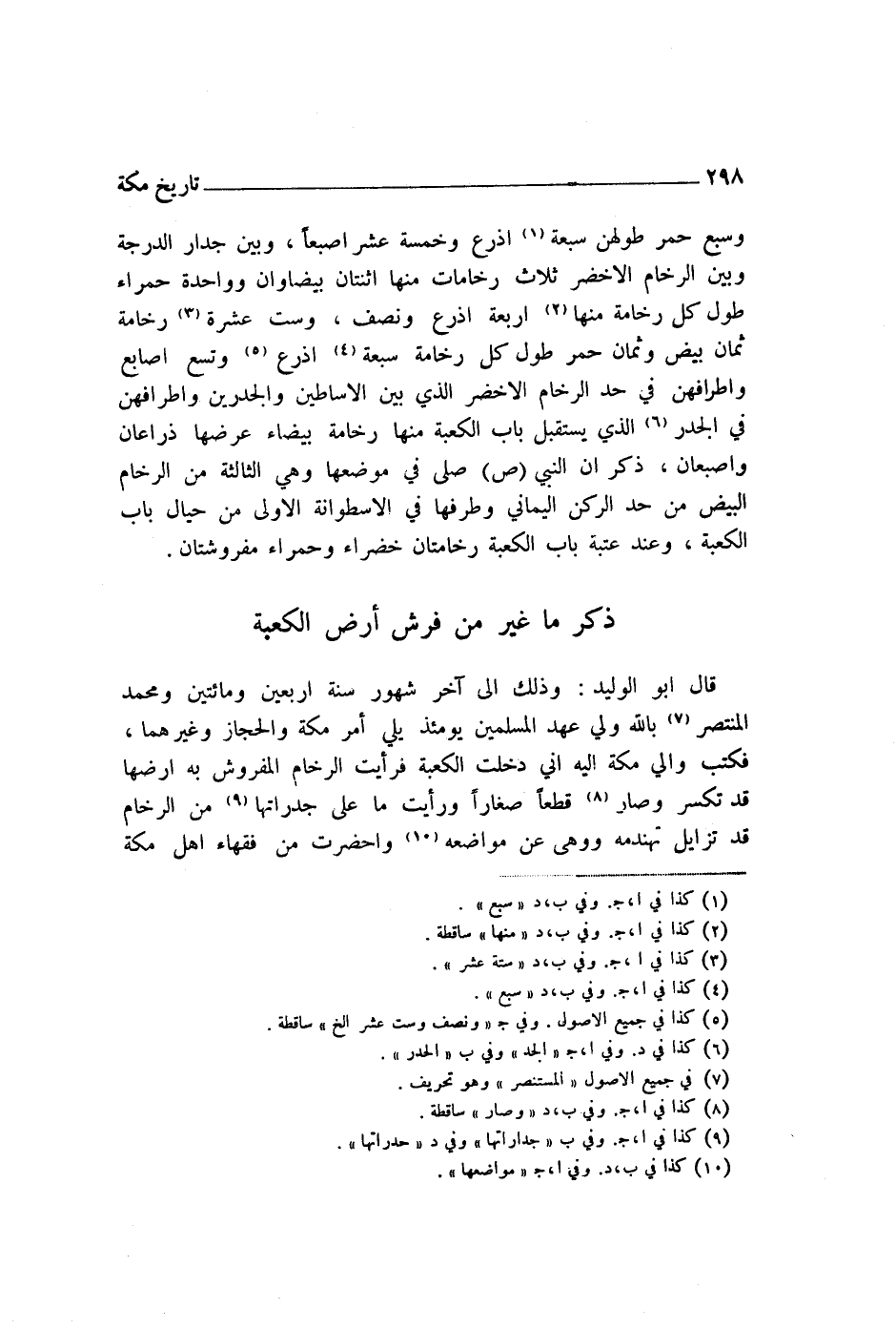§ذِكْرُ مَا غُيِّرَ مِنْ فَرْشِ أَرْضِ الْكَعْبَةِ قَالَ أَبُو الْوَلِيدِ: وَذَلِكَ إِلَى آخِرِ شُهُورِ سَنَةِ أَرْبَعِينَ وَمِائَتَيْنِ، وَمُحَمَّدُ الْمُنْتَصِرُ بِاللَّهِ وَلِيُّ عَهْدِ الْمُسْلِمِينَ يَوْمَئِذٍ يَلِي أَمْرَ مَكَّةَ وَالْحِجَازِ وَغَيْرِهِمَا، فَكَتَبَ وَالِي مَكَّةَ إِلَيْهِ أَنِّي دَخَلْتُ الْكَعْبَةَ فَرَأَيْتُ الرُّخَامَ الْمَفْرُوشَ بِهِ أَرْضُهَا قَدْ تَكَسَّرَ وَصَارَ قِطَعًا صِغَارًا وَرَأَيْتُ مَا عَلَى جُدُرَاتِهَا مِنَ الرُّخَامِ قَدْ تَزَايَلَ تَهَنْدُمُهُ وَوَهَى عَنْ مَوَاضِعِهِ وَأَحْضَرْتُ مِنْ فُقَهَاءِ أَهْلِ مَكَّةَ