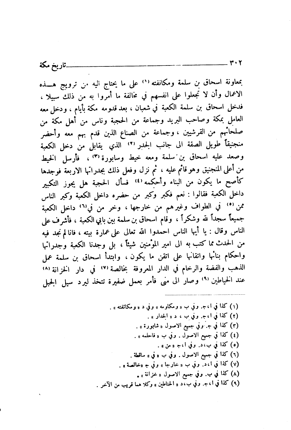 بِمَعَاوَنَةِ إِسْحَاقَ بْنِ سَلَمَةَ وَمُكَانَفَتِهِ عَلَى مَا يَحْتَاجُ إِلَيْهِ مِنْ تَرْوِيحِ هَذِهِ الْأَعْمَالِ وَأَنْ لَا تَجْعَلُوا عَلَى أَنْفُسِهِمْ فِي مُخَالَفَةِ مَا أَمَرُوا بِهِ مِنْ ذَلِكَ سَبِيلًا. فَدَخَلَ إِسْحَاقُ بْنُ سَلَمَةَ الْكَعْبَةَ فِي شَعْبَانَ، بَعْدَ قُدُومِهِ مَكَّةَ بِأَيَّامٍ، وَدَخَلَ مَعَهُ الْعَامِلُ بِمَكَّةَ وَصَاحِبُ الْبَرِيدِ وَجَمَاعَةٌ مِنَ الْحَجَبَةِ وَنَاسٌ مِنْ أَهْلِ مَكَّةَ مِنْ صُلَحَائِهِمْ مِنَ الْقُرَشِيِّينَ، وَجَمَاعَةٌ مِنَ الصُّنَّاعِ الَّذِينَ قَدِمَ بِهِمْ مَعَهُ وَأَحْضَرَ مَنْجَنِيقًا طَوِيلَ الصُّقَّةِ إِلَى جَانِبِ الْجَدْرِ الَّذِي يُقَابِلُ مَنْ دَخَلَ الْكَعْبَةَ وَصَعِدَ عَلَيْهِ إِسْحَاقُ بْنُ سَلَمَةَ وَمَعَهُ خَيْطٌ وَسَابُورَةٌ، فَأَرْسَلَ الْخَيْطَ مِنْ أَعْلَى الْمَنْجَنِيقِ وَهُوَ قَائِمٌ عَلَيْهِ، ثُمَّ نَزَلَ وَفَعَلَ ذَلِكَ بِجُدُرَاتِهَا الْأَرْبَعَةِ فَوَجَدَهَا كَأَصَحِّ مَا يَكُونُ مِنَ الْبِنَاءِ وَأَحْكَمِهِ فَسَأَلَ الْحَجَبَةَ هَلْ يَجُوزُ التَّكْبِيرُ دَاخِلَ الْكَعْبَةِ فَقَالُوا: نَعَمْ فَكَبَّرَ وَكَبَّرَ مَنْ حَضَرَهُ دَاخِلَ الْكَعْبَةِ وَكَبَّرَ النَّاسُ مِمَّنْ فِي الطَّوَافِ وَغَيْرِهِمْ مِنْ خَارِجِهَا، وَخَرَّ مَنْ فِي دَاخِلِ الْكَعْبَةِ جَمِيعًا سُجَّدًا لِلَّهِ وَشُكْرًا، وَقَامَ إِسْحَاقُ بْنُ سَلَمَةَ بَيْنَ بَابَيِ الْكَعْبَةِ، فَأَشْرَفَ عَلَى النَّاسِ، وَقَالَ: يَا أَيُّهَا النَّاسُ احْمَدُوا اللَّهَ تَعَالَى عَلَى عِمَارَةِ بَيْتِهِ، فَإِنَّا لَمْ نَجِدْ فِيهِ مِنَ الْحَدَثِ مِمَّا كُتِبَ بِهِ إِلَى أَمِيرِ الْمُؤْمِنِينَ شَيْئًا، بَلْ وَجَدْنَا الْكَعْبَةَ وَجُدُرَاتِهَا وَإِحْكَامِ بِنَائِهَا وَإِتْقَانِهَا عَلَى أَتْقَنِ مَا يَكُونُ، وَابْتَدَأَ إِسْحَاقُ بْنُ سَلَمَةَ عَمَلَ الذَّهَبِ وَالْفِضَّةِ وَالرُّخَامِ فِي الدَّارِ الْمَعْرُوفَةِ بِخَالِصَةٍ فِي دَارِ الْخِزَانَةِ عِنْدَ الْخَيَّاطِينَ، وَصَارَ إِلَى مِنًى، فَأَمَرَ بِعَمَلِ ضَفِيرَةٍ تُتَّخَذُ لِيَرُدَّ سَيْلَ الْجَبَلِ