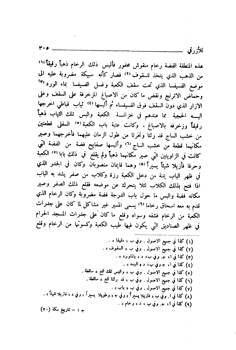 هَذَا الْمِنْطَقَةِ الْفِضَّةِ رُخَامٌ مَنْقُوشٌ مَحْفُورٌ، فَأَلْبَسَ ذَلِكَ الرُّخَامَ ذَهَبًا رَقِيقًا مِنَ الذَّهَبِ الَّذِي يُتَّخَذَ لِلسُّقُوفِ، فَصَارَ كَأَنَّهُ سَبِيكَةٌ مَضْرُوبَةٌ عَلَيْهِ إِلَى مَوْضِعِ الْفُسَيْفِسَاءِ الَّتِي تَحْتَ سَقْفِ الْكَعْبَةِ، وَغَسَلَ الْفُسَيْفِسَاءَ بِمَاءِ الْوَرْدِ وَحُمَاضِ الْأُتْرُجِّ، وَنَقَضَ مَا كَانَ مِنَ الْأَصْبَاغِ الْمُزْخَرَفَةِ عَلَى السَّقْفِ وَعَلَى الْإِزَارِ الَّذِي دُونَ السَّقْفِ فَوْقَ الْفُسَيْفِسَاءِ، ثُمَّ أَلْبَسَهَا ثِيَابَ قَبَاطِيٍّ أَخْرَجَهَا إِلَيْهِ الْحَجَبَةُ مِمَّا عِنْدَهُمْ فِي خِزَانَةِ الْكَعْبَةِ، وَأَلْبَسَ تِلْكَ الثِّيَابَ ذَهَبًا رَقِيقًا وَزَخْرَفَهُ بِالْأَصْبَاغِ، وَكَانَتْ عَتَبَةُ بَابِ الْكَعْبَةِ السُّفْلَى قِطْعَتَيْنِ مِنْ خَشَبِ السَّاجِ قَدْ رَثَّتَا وَنَخِرَتَا مِنْ طُولِ الزَّمَانِ عَلَيْهِما، فَأَخْرَجَهُمَا وَصَيَّرَ مَكَانَهَا قِطْعَةً مِنْ خَشَبِ السَّاجِ، وَأَلْبَسَهَا صَفَايِحَ فِضَّةٍ مِنَ الْفِضَّةِ الَّتِي كَانَتْ فِي الزَّاوِيَتَيْنِ الَّتِي صَيَّرَ مَكَانَهُمَا ذَهَبًا وَلَمْ يَقْلَعْ فِي ذَلِكَ بَابَ الْكَعْبَةِ، وَحُرِّفَا فَأُزِيلَا شَيْئًا يَسِيرًا، وَهُمَا قَائِمَانِ مَنْصُوبَانِ، وَكَانَ فِي الْجَدْرِ الَّذِي فِي ظَهْرِ الْبَابِ يَمْنَةَ مَنْ دَخَلَ الْكَعْبَةَ رَزَّةٌ وَكُلَّابٌ مِنْ صُفْرٍ يُشَدُّ بِهِ الْبَابُ إِذَا فُتِحَ بِذَلِكَ الْكُلَّابِ لِئَلَّا يَتَحَرَّكَ عَنْ مَوْضِعِهِ، فَقَلَعَ ذَلِكَ الصُّفْرَ، وَصَيَّرَ مَكَانَهُ فِضَّةً، وَأَلْبَسَ مَا حَوْلَ بَابِ الدَّرَجَةِ فِضَّةً مَضْرُوبَةً، وَكَانَ الرُّخَامُ الَّذِي قَدِمَ بِهِ مَعَهُ إِسْحَاقُ رُخَامًا يُسَمَّى الْمُسَيَّرَ، غَيْرَ مُشَاكِلٍ لِمَا كَانَ عَلَى جُدُرَاتِ الْكَعْبَةِ مِنَ الرُّخَامِ، فَشَقَّهُ وَسَوَّاهُ وَقَلَعَ