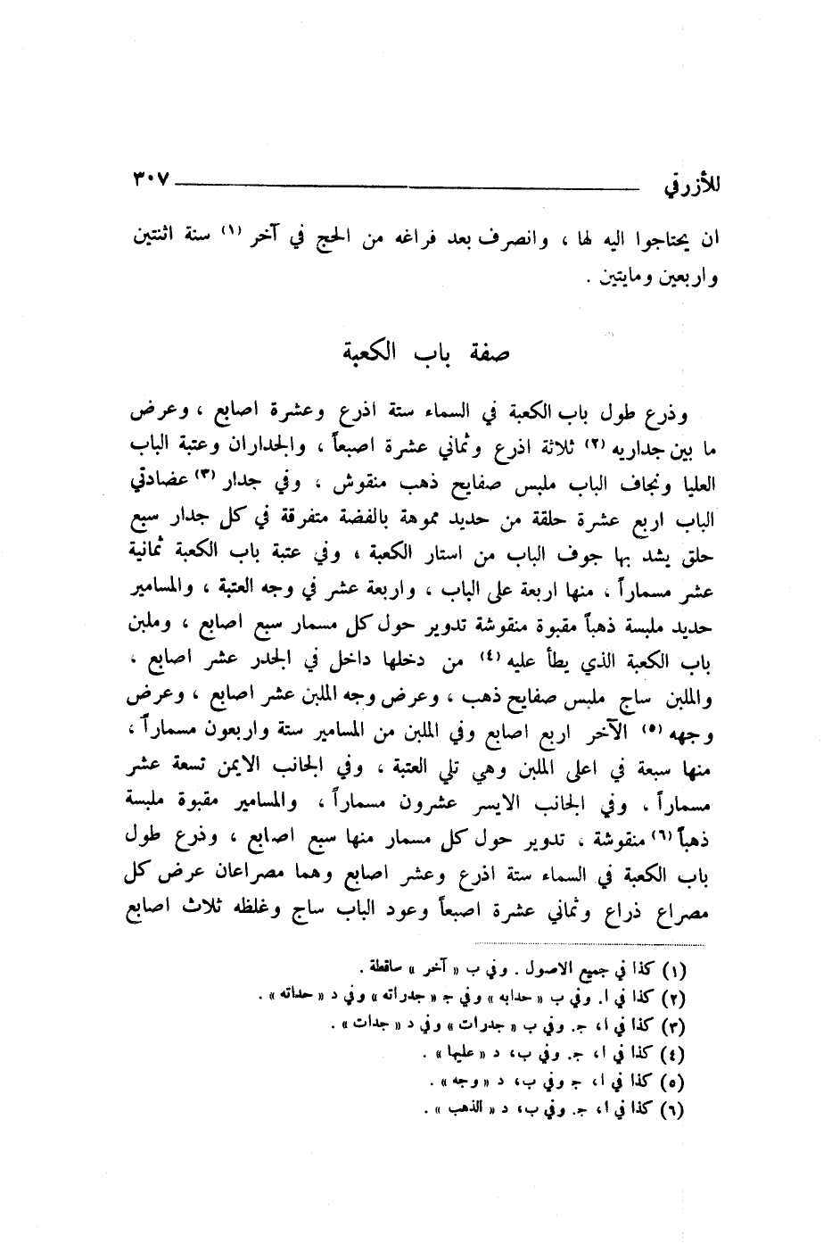 §صِفَةُ بَابِ الْكَعْبَةِ وَذَرْعُ طُولِ بَابِ الْكَعْبَةِ فِي السَّمَاءِ سِتَّةُ أَذْرُعٍ وَعَشَرَةُ أَصَابِعَ، وَعَرْضُ مَا بَيْنَ جِدَارَيْهِ ثَلَاثَةُ أَذْرُعٍ وَثَمَانِيَ عَشْرَ أُصْبُعًا، وَالْجِدَارَانِ وَعَتَبَةُ الْبَابِ الْعُلْيَا وَنِجَافُ الْبَابِ مُلَبَّسٌ صَفَايِحَ ذَهَبٍ مَنْقُوشٍ، وَفِي جِدَارِ عِضَادَتَيِ الْبَابِ أَرْبَعَ عَشْرَةَ حَلْقَةً مِنْ حَدِيدٍ مُمَوَّهَةً بِالْفِضَّةِ مُتَفَرِّقَةً، فِي كُلِّ جِدَارٍ سَبْعُ حِلَقٍ يُشَدُّ بِهَا جَوْفُ الْبَابِ مِنْ أَسْتَارِ الْكَعْبَةِ، وَفِي عَتَبَةِ بَابِ الْكَعْبَةِ ثَمَانِيَةَ عَشَرَ مِسْمَارًا، مِنْهَا أَرْبَعَةٌ عَلَى الْبَابِ، وَأَرْبَعَةَ عَشَرَ فِي وَجْهِ الْعَتَبَةِ، وَالْمَسَامِيرُ حَدِيدٌ مُلَبَّسَةٌ ذَهَبًا مَقْبُوَّةٌ مَنْقُوشَةٌ، تَدْوِيرُ حَوْلَ كُلِّ مِسْمَارٍ سَبْعُ أَصَابِعَ، وَمَلْبَنُ بَابِ الْكَعْبَةِ الَّذِي يَطَأُ عَلَيْهِ مَنْ دَخَلَهَا دَاخِلٌ فِي الْجَدْرِ عَشْرَ أَصَابِعَ وَالْمَلْبَنُ سَاجٌ مُلَبَّسٌ صَفَايِحَ ذَهَبٍ، وَعَرْضُ وَجْهِ الْمَلْبَنِ عَشْرُ أَصَابِعَ، وَعَرْضُ وَجْهِهِ الْآخَرِ أَرْبَعُ أَصَابِعَ وَفِي الْمَلْبَنِ مِنَ الْمَسَامِيرِ سِتَّةٌ وَأَرْبَعُونَ مِسْمَارًا، مِنْهَا سَبْعَةٌ فِي أَعْلَى الْمَلْبَنِ وَهِيَ تَلِي الْعَتَبَةَ، وَفِي الْجَانِبِ الْأَيْمَنِ تِسْعَةَ عَشَرَ مِسْمَارًا، وَفِي الْجَانِبِ الْأَيْسَرِ عِشْرُونَ مِسْمَارًا، وَالْمَسَامِيرُ مَقْبُوَّةٌ مُلَبَّسَةٌ ذَهَبًا مَنْقُوشَةٌ، تَدْوِيرُ حَوْلَ كُلِّ مِسْمَارٍ مِنْهَا سَبْعُ أَصَابِعَ، وَذَرْعُ طُولِ بَابِ الْكَعْبَةِ فِي السَّمَاءِ سِتَّةُ أَذْرُعٍ وَعَشْرُ أَصَابِعَ وَهُمَا مِصْرَاعَانِ عَرْضُ كُلِّ مِصْرَاعٍ ذِرَاعٌ وَثَمَانِيَ عَشْرَةَ أُصْبُعًا وَعُودُ الْبَابِ سَاجٌ وَغِلَظُهُ ثَلَاثُ أَصَابِعَ