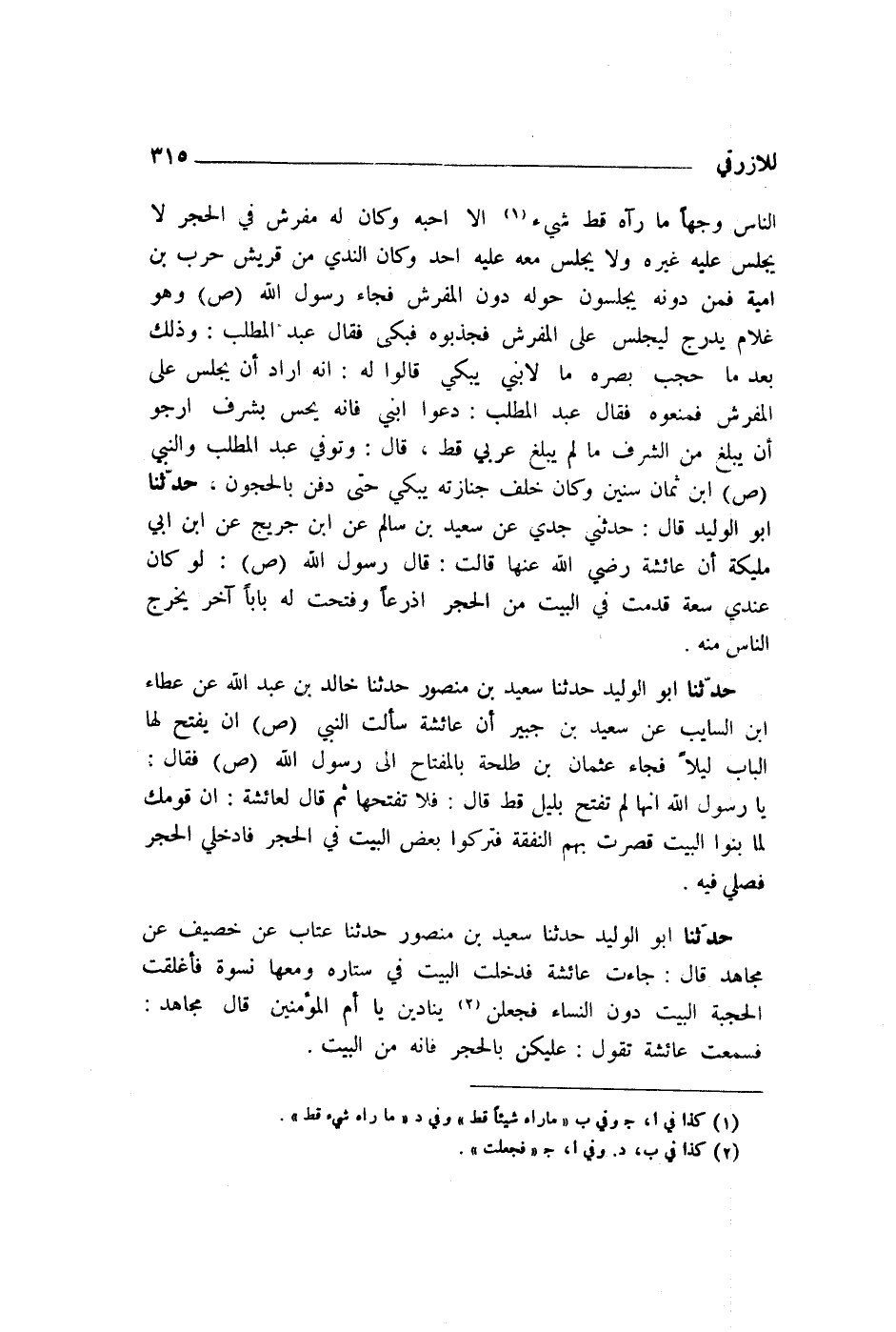 حَدَّثَنَا أَبُو الْوَلِيدِ قَالَ: حَدَّثَنَا سَعِيدُ بْنُ مَنْصُورٍ، حَدَّثَنَا خَالِدُ بْنُ عَبْدِ اللَّهِ، عَنْ عَطَاءِ بْنِ السَّائِبِ، عَنْ سَعِيدِ بْنِ جُبَيْرٍ أَنَّ عَائِشَةَ، سَأَلْتِ النَّبِيَّ صَلَّى اللهُ عَلَيْهِ وَسَلَّمَ أَنْ يَفْتَحَ لَهَا الْبَابَ لَيْلًا فَجَاءَ عُثْمَانُ بْنُ طَلْحَةَ بِالْمِفْتَاحِ إِلَى رَسُولِ اللَّهِ صَلَّى اللهُ عَلَيْهِ وَسَلَّمَ فَقَالَ: يَا رَسُولَ اللَّهِ إِنَّهَا لَمْ تُفْتَحْ بِلَيْلٍ قَطُّ قَالَ: «فَلَا تَفْتَحْهَا» ثُمَّ قَالَ لِعَائِشَةَ: «§إِنَّ قَوْمَكِ لَمَّا بَنَوْا الْبَيْتَ قَصُرَتْ بِهِمُ النَّفَقَةُ فَتَرَكُوا بَعْضَ الْبَيْتِ فِي الْحِجْرِ فَادْخُلِي الْحِجْرَ فَصَلِّي فِيهِ»