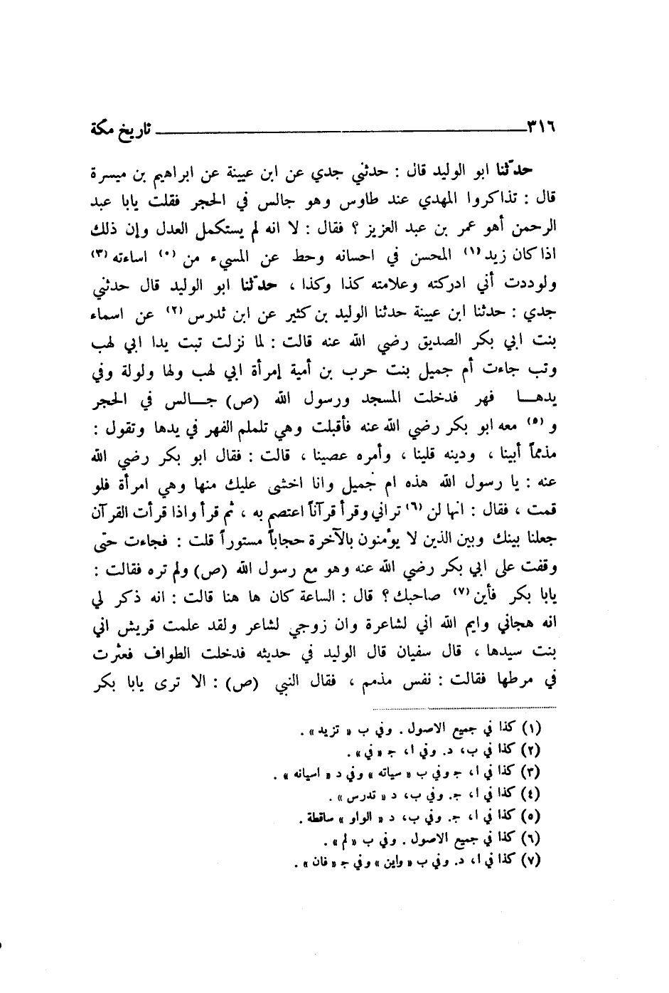 حَدَّثَنَا أَبُو الْوَلِيدِ قَالَ: حَدَّثَنِي جَدِّي، حَدَّثَنَا ابْنُ عُيَيْنَةَ، حَدَّثَنَا الْوَلِيدُ بْنُ كَثِيرٍ، عَنِ ابْنِ ثَدْرُسَ، عَنْ أَسْمَاءَ بِنْتِ أَبِي بَكْرٍ الصِّدِّيقِ رَضِيَ اللَّهُ عَنْهُ قَالَتْ: لَمَّا نَزَلَتْ {§تَبَّتْ يَدَا أَبِي لَهَبٍ وَتَبَّ} [المسد: 1] ، جَاءَتْ أُمُّ جَمِيلٍ بِنْتُ حَرْبِ بْنِ أُمَيَّةَ امْرَأَةُ أَبِي لَهَبٍ وَلَهَا وَلْوَلَةٌ وَفِي يَدِهَا فِهْرٌ فَدَخَلَتِ الْمَسْجِدَ وَرَسُولُ اللَّهِ صَلَّى اللهُ عَلَيْهِ وَسَلَّمَ جَالِسٌ فِي الْحِجْرِ وَمَعَهُ أَبُو بَكْرٍ رَضِيَ اللَّهُ عَنْهُ، فَأَقْبَلَتْ وَهِيَ تُلَمْلِمُ الْفِهْرَ فِي يَدِهَا وَتَقُولُ: مُذَمَّمًا أَبَيْنَا، وَدِينَهُ قَلَيْنَا، وَأَمْرَهُ عَصَيْنَا، قَالَتْ: فَقَالَ أَبُو بَكْرٍ رَضِيَ اللَّهُ عَنْهُ: يَا رَسُولَ اللَّهِ، هَذِهِ أُمُّ جَمِيلٍ وَأَنَا أَخْشَى عَلَيْكَ مِنْهَا وَهِيَ امْرَأَةٌ فَلَوْ قُمْتَ، فَقَالَ: «إِنَّهَا لَنْ تَرَانِي» وَقَرَأَ قُرْآنًا اعْتَصَمَ بِهِ، ثُمَّ قَرَأَ {وَإِذَا قَرَأْتَ الْقُرْآنَ جَعَلْنَا بَيْنَكَ وَبَيْنَ الَّذِينَ لَا يُؤْمِنُونَ بِالْآخِرَةِ حِجَابًا مَسْتُورًا} [الإسراء: 45] قُلْتُ: فَجَاءَتْ حَتَّى وَقَفَتْ عَلَى أَبِي بَكْرٍ رَضِيَ اللَّهُ عَنْهُ وَهُوَ مَعَ رَسُولِ اللَّهِ صَلَّى اللهُ عَلَيْهِ وَسَلَّمَ وَلَمْ تَرَهُ فَقَالَتْ: يَا أَبَا بَكْرٍ فَأَيْنَ صَاحِبُكَ؟ قَالَ: السَّاعَةَ كَانَ هَاهُنَا قَالَتْ: إِنَّهُ ذُكِرَ لِي أَنَّهُ هَجَانِي وَايْمُ اللَّهِ إِنِّي لَشَاعِرَةٌ وَإِنَّ زَوْجِي لَشَاعِرٌ وَلَقَدْ عَلِمَتْ قُرَيْشٌ أَنِّي بِنْتُ سَيِّدِهَا قَالَ سُفْيَانُ: قَالَ الْوَلِيدُ فِي حَدِيثِهِ: " فَدَخَلَتِ الطَّوَافَ فَعَثَرَتْ فِي مِرْطِهَا فَقَالَتْ: نَفْسُ مُذَمَّمٍ، فَقَالُ النَّبِيُّ صَلَّى اللهُ عَلَيْهِ وَسَلَّمَ: «أَلَا تَرَى يَا أَبَا بَكْرٍ -[317]- مَا يَدْفَعُ اللَّهُ تَعَالَى بِهِ عَنِّي مِنْ شَتْمِ قُرَيْشٍ؟ يُسَمُّونَنِي مُذَمَّمًا وَأَنَا مُحَمَّدٌ» فَقَالَتْ لَهَا أُمُّ حَكِيمٍ ابْنَةُ عَبْدِ الْمُطَّلِبِ: مَهْلًا يَا أُمَّ جَمِيلٍ، إِنَّى لَحَصَانٌ فَمَا أُكَلَّمُ، وَثَقَافٌ فَمَا أُعَلَّمُ وَكِلْتَانَا مِنْ بَنِي الْعَمِّ، ثُمَّ قُرَيْشٌ بَعْدُ أَعْلَمُ " قَالَ أَبُو الْوَلِيدِ: فَلَمْ يَزَلْ رُخَامُ الْحِجْرِ الَّذِي عَمِلَهُ الْمَهْدِيُّ بَعْدَ عَمَلِ أَبِي جَعْفَرٍ أَمِيرِ الْمُؤْمِنِينَ عَلَى حَالِهِ وَكَانَ سَيْلُهُ يَخْرُجُ مِنْ تَحْتِ الْأَحْجَارِ الَّتِي عَلَى بَابِهَا الْغَرْبِيِّ حَتَّى رَثَّ فِي خِلَافَةِ الْمُتَوَكِّلِ عَلَى اللَّهِ جَعْفَرٍ أَمِيرِ الْمُؤْمِنِينَ فَقُلِعَ فِي سَنَةِ إِحْدَى وَأَرْبَعِينَ وَمِائَتَيْنِ وَأُلْبِسَ رُخَامًا حَسَنًا قُلِعَ مِنْ جَوَانِبِ الْمَسْجِدِ الْحَرَامِ مِنَ الشِّقِّ الَّذِي يَلِي بَابَ الْعَجَلَةِ إِلَى بَابِ دَارِ عَمْرِو بْنِ الْعَاصِ وَمِمَّا يَلِي أَبْوَابَ بَنِي مَخْزُومٍ وَالْبَابِ الَّذِي مُقَابِلٌ دَارَ عَبْدِ اللَّهِ بْنِ جُدْعَانَ، وَكَانَ عَبْدُ اللَّهِ بْنُ عُبَيْدِ اللَّهِ بْنِ عَبَّاسِ بْنِ مُحَمَّدٍ الْهَاشِمِيُّ أَمَرَ أَنْ يُقْلَعَ لَهُ لَوْحٌ مِنْ رُخَامِ الْحِجْرِ يَسْجُدُ عَلَيْهِ فَقُلِعَ لَهُ فِي الْمَوْسِمِ فَأَرْسَلَ أَحْمَدُ بْنُ طَرِيفٍ مَوْلَى الْعَبَّاسِ بْنِ مُحَمَّدٍ الْهَاشِمِيِّ بِرُخَامَتَيْنِ خَضْرَاوَيْنِ مِنْ مِصْرَ هَدِيَّةً لِلْحِجْرِ مَكَانَ ذَلِكَ اللَّوْحِ وَهِيَ الرُّخَامَةُ الْخَضْرَاءُ عَلَى سَطْحِ جِدَارِ الْحِجْرِ مُقَابِلَ الْمِيزَابِ عَلَى هَيْئَةِ الزَّوْرَقِ، وَالرُّخَامَةُ الْأُخْرَى هِيَ الرُّخَامَةُ الْخَضْرَاءُ الَّتِي تَحْتَ الْمِيزَابِ تَلِي جَدْرَ الْكَعْبَةِ فَجُعِلَتَا 
