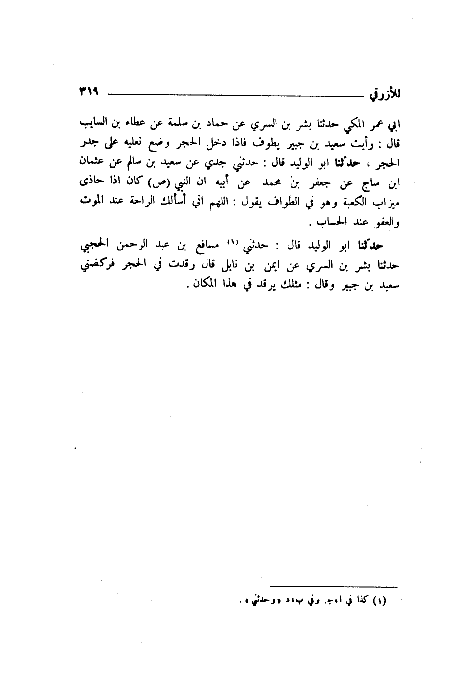 حَدَّثَنَا أَبُو الْوَلِيدِ قَالَ: حَدَّثَنِي مُسَافِعُ بْنُ عَبْدِ الرَّحْمَنِ الْحَجَبِيُّ، حَدَّثَنَا بِشْرُ بْنُ السَّرِيِّ، عَنْ أَيْمَنَ بْنِ نَايِلٍ قَالَ: §رَقَدْتُ فِي الْحِجْرِ فَرَكَضَنِي سَعِيدُ بْنُ جُبَيْرٍ وَقَالَ: مِثْلُكَ يَرْقُدُ فِي هَذَا الْمَكَانِ؟
