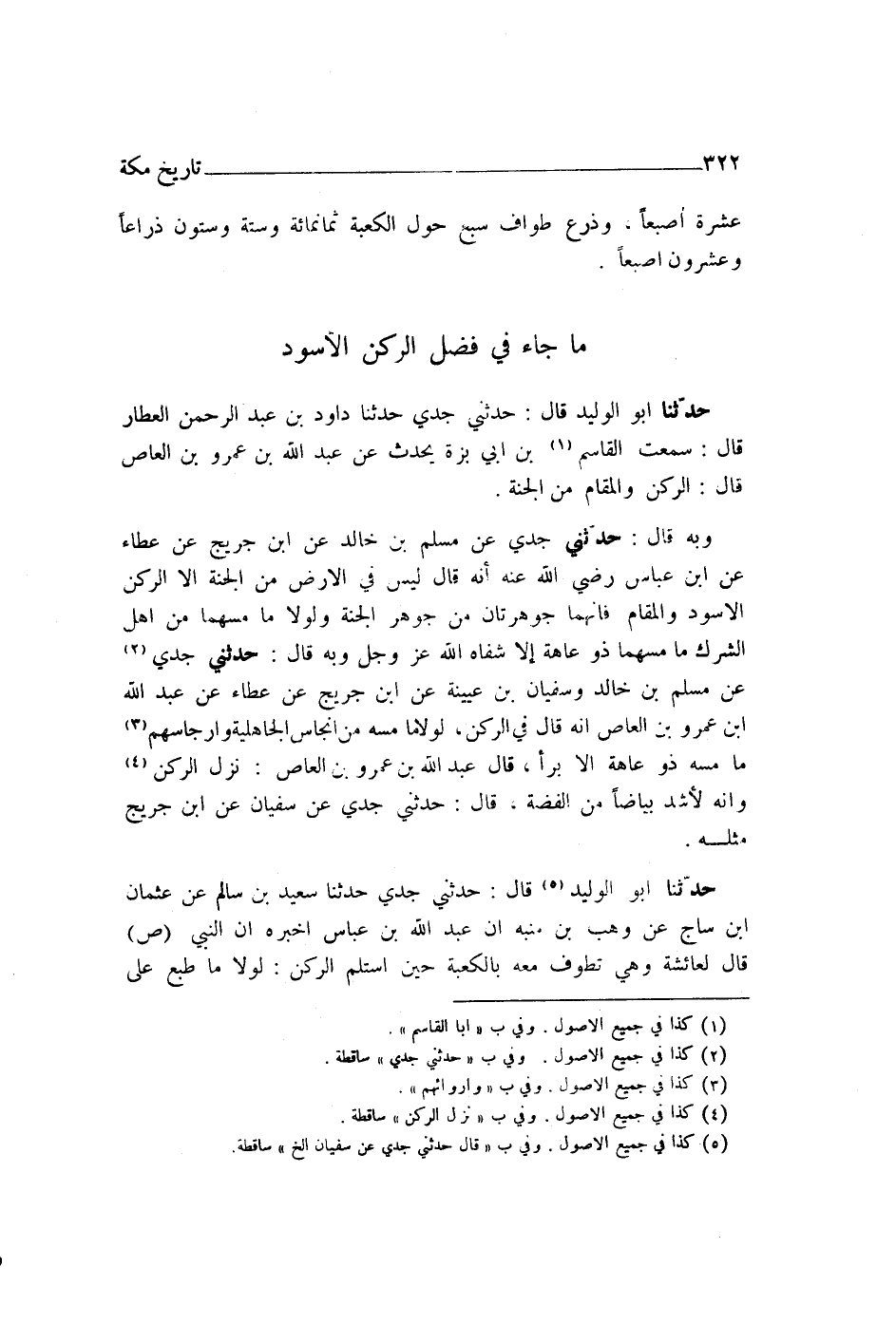 حَدَّثَنَا أَبُو الْوَلِيدِ قَالَ: حَدَّثَنِي جَدِّي، حَدَّثَنَا دَاوُدُ بْنُ عَبْدِ الرَّحْمَنِ الْعَطَّارُ قَالَ: سَمِعْتُ الْقَاسِمَ بْنَ أَبِي بَزَّةَ يُحَدِّثُ عَنْ عَبْدِ اللَّهِ بْنِ عَمْرِو بْنِ الْعَاصِ قَالَ: §الرُّكْنُ وَالْمَقَامُ مِنَ الْجَنَّةِ "