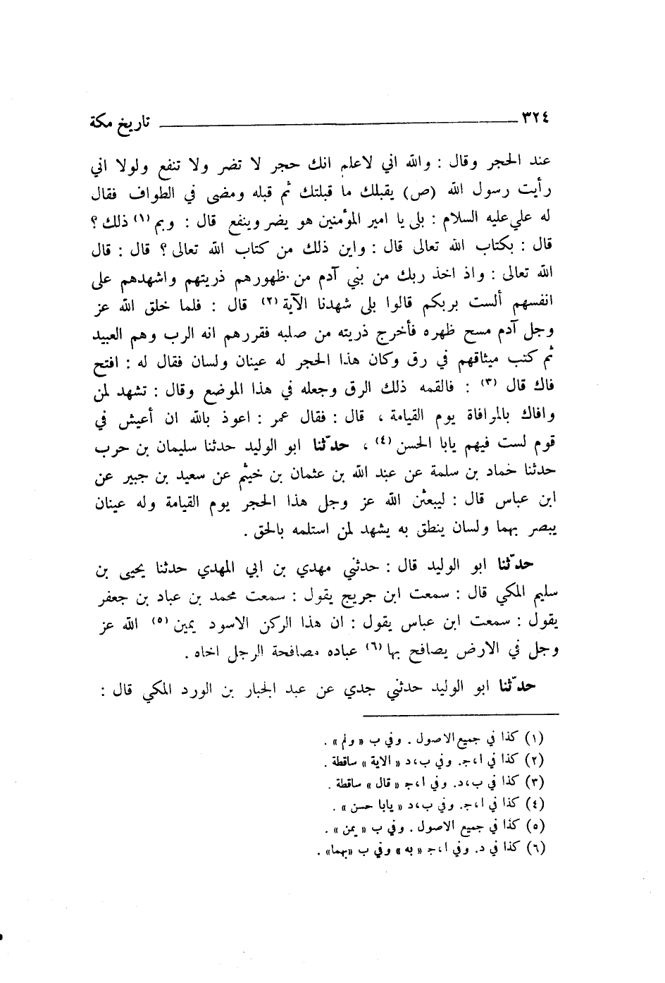 حَدَّثَنَا أَبُو الْوَلِيدِ قَالَ: حَدَّثَنِي مَهْدِيُّ بْنُ أَبِي الْمَهْدِيِّ، حَدَّثَنَا يَحْيَى بْنُ سُلَيْمٍ الْمَكِّيُّ، قَالَ: سَمِعْتُ ابْنَ جُرَيْجٍ، يَقُولُ: سَمِعْتُ مُحَمَّدَ بْنَ عَبَّادِ بْنِ جَعْفَرٍ، يَقُولُ: سَمِعْتُ ابْنَ عَبَّاسٍ، يَقُولُ: «§إِنَّ هَذَا الرُّكْنَ الْأَسْوَدَ يَمِينُ اللَّهِ عَزَّ وَجَلَّ فِي الْأَرْضِ، يُصَافِحُ بِهَا عِبَادَهُ مُصَافَحَةَ الرَّجُلِ أَخَاهُ»