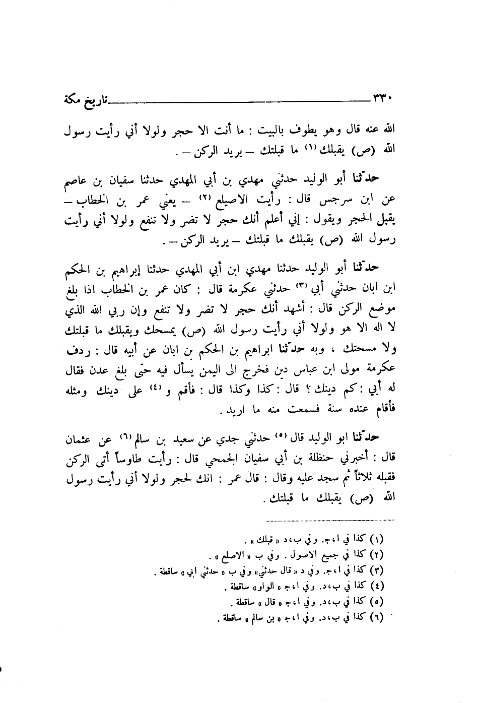 حَدَّثَنَا أَبُو الْوَلِيدِ قَالَ: حَدَّثَنَا مَهْدِيُّ بْنُ أَبِي الْمَهْدِيِّ، حَدَّثَنَا إِبْرَاهِيمُ بْنُ الْحَكَمِ بْنِ أَبَانَ، حَدَّثَنِي أَبِي، حَدَّثَنِي عِكْرِمَةُ، قَالَ: كَانَ عُمَرُ بْنُ الْخَطَّابِ إِذَا بَلَغَ مَوْضِعَ الرُّكْنِ قَالَ: «§أَشْهَدُ أَنَّكَ حَجَرٌ لَا تَضُرُّ وَلَا تَنْفَعُ، وَإِنَّ رَبِّيَ اللَّهُ الَّذِي لَا إِلَهَ إِلَّا هُوَ، وَلَوْلَا أَنِّي رَأَيْتُ رَسُولَ اللَّهِ صَلَّى اللهُ عَلَيْهِ وَسَلَّمَ يَمْسَحُكَ وَيُقَبِّلُكَ مَا قَبَّلْتُكَ وَلَا مَسَحْتُكَ»