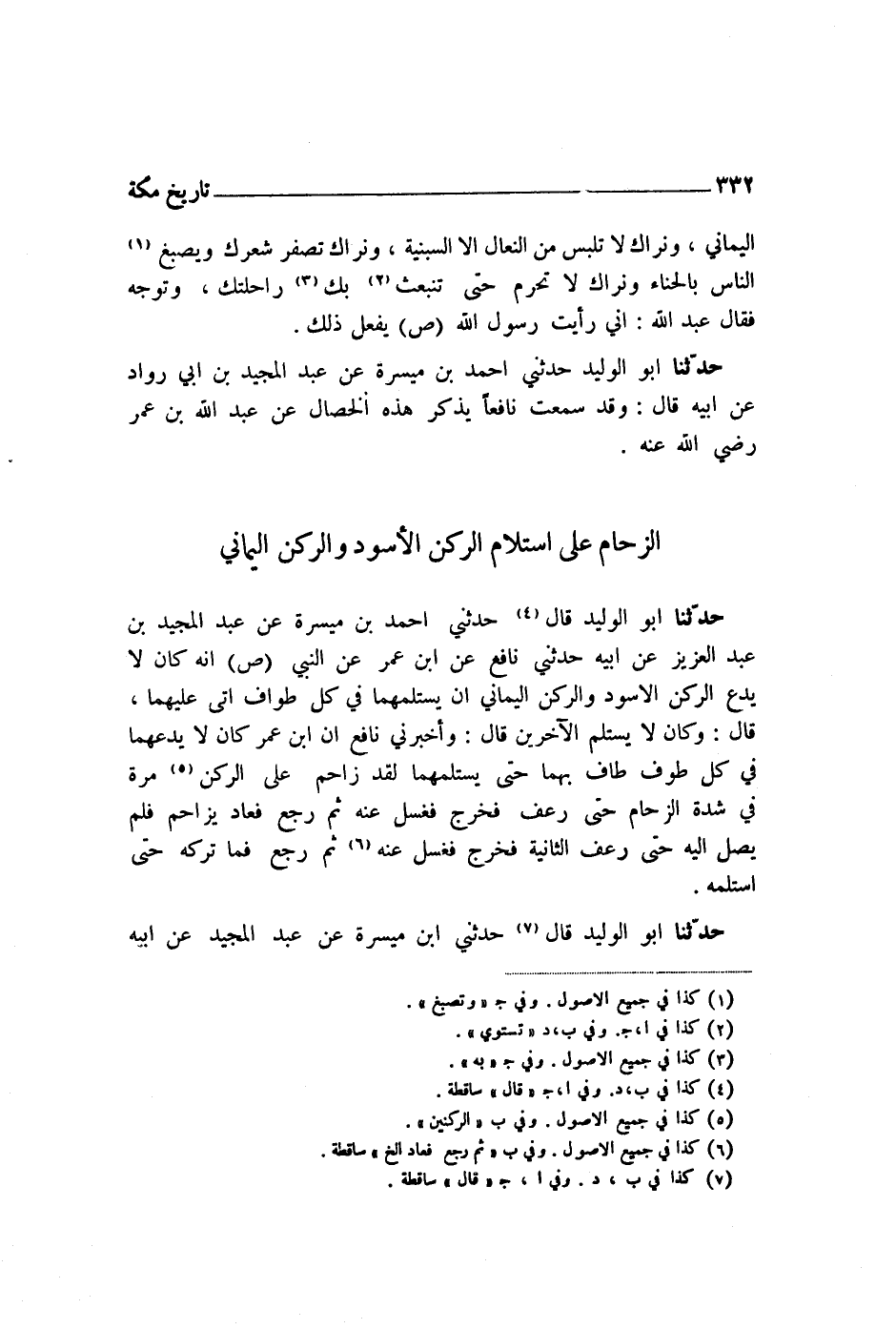 حَدَّثَنَا أَبُو الْوَلِيدِ قَالَ: حَدَّثَنِي ابْنُ مَيْسَرَةَ، عَنْ عَبْدِ الْمَجِيدِ، عَنْ أَبِيهِ -[333]-، عَنْ نَافِعٍ، قَالَ: لَقَدْ «رَأَيْتُ ابْنَ عُمَرَ §زَاحَمَ مَرَّةً عَلَى الرُّكْنِ الْيَمَانِيِّ حَتَّى انْبَهَرَ، فَتَنَحَّى فَجَلَسَ فِي نَاحِيَةِ الطَّوَافِ حَتَّى اسْتَرَاحَ ثُمَّ عَادَ، فَلَمْ يَدَعْهُ حَتَّى اسْتَلَمَهُ» قَالَ أَحْمَدُ بْنُ مَيْسَرَةَ: أَخْبَرَنَا عَبْدُ الْمَجِيدِ: قَالَ أَبِي: «لَيْسَ هَذَا بِوَاجِبٍ عَلَى النَّاسِ، وَلَكِنَّهُ كَانَ يُحِبُّ أَنْ يَصْنَعَ كَمَا صَنَعَ النَّبِيُّ صَلَّى اللهُ عَلَيْهِ وَسَلَّمَ»