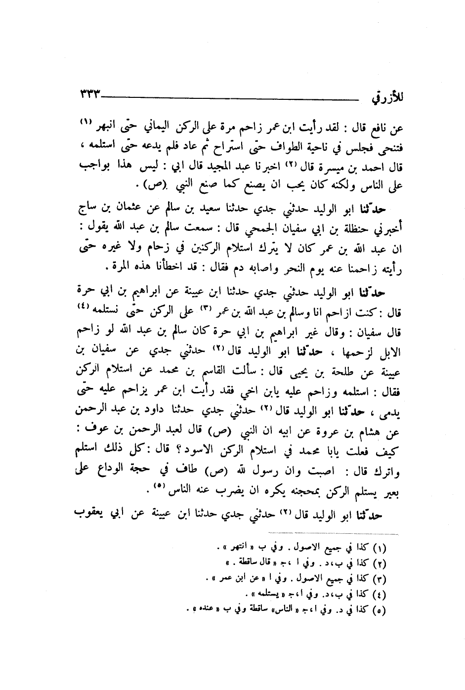 حَدَّثَنَا أَبُو الْوَلِيدِ قَالَ: حَدَّثَنِي جَدِّي، عَنْ سُفْيَانَ بْنِ عُيَيْنَةَ، عَنْ طَلْحَةَ بْنِ يَحْيَى، قَالَ: سَأَلْتُ الْقَاسِمَ بْنَ مُحَمَّدٍ عَنِ اسْتِلَامِ الرُّكْنِ فَقَالَ: اسْتَلِمْهُ وَزَاحِمْ عَلَيْهِ يَا ابْنَ أَخِي؛ فَقَدْ §رَأَيْتُ ابْنَ عُمَرَ يُزَاحِمُ عَلَيْهِ حَتَّى يَدْمَى "