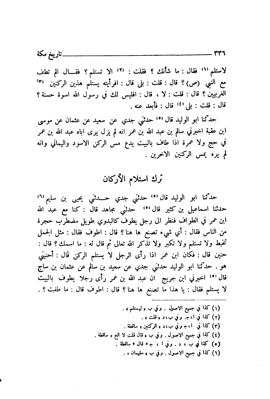 حَدَّثَنَا أَبُو الْوَلِيدِ قَالَ: حَدَّثَنِي جَدِّي، حَدَّثَنِي يَحْيَى بْنُ سُلَيْمٍ، حَدَّثَنَا إِسْمَاعِيلُ بْنُ كَثِيرٍ، قَالَ: حَدَّثَنِي مُجَاهِدٌ، قَالَ: كُنَّا مَعَ عَبْدِ اللَّهِ بْنِ عُمَرَ فِي الطَّوَافِ، فَنَظَرَ إِلَى رَجُلٍ يَطُوفُ كَالْبَدَوِيِّ طَوِيلٍ مُضْطَرِبٍ حَجْرَةً مِنَ النَّاسِ، فَقَالَ: «أَيَّ شَيْءٍ تَصْنَعُ هَاهُنَا؟» قَالَ: أَطُوفُ. فَقَالَ: «مِثْلَ الْجَمَلِ تُخَبِّطُ وَلَا تَسْتَلِمُ وَلَا تُكَبِّرُ وَلَا تَذْكُرُ اللَّهَ تَعَالَى؟» ثُمَّ قَالَ لَهُ: «مَا اسْمُكَ؟» قَالَ: حُنَيْنٌ. قَالَ: فَكَانَ ابْنُ عُمَرَ §إِذَا رَأَى الرَّجُلَ لَا يَسْتَلِمُ الرُّكْنَ قَالَ: «أَحُنَيْنِيٌّ هُوَ؟»