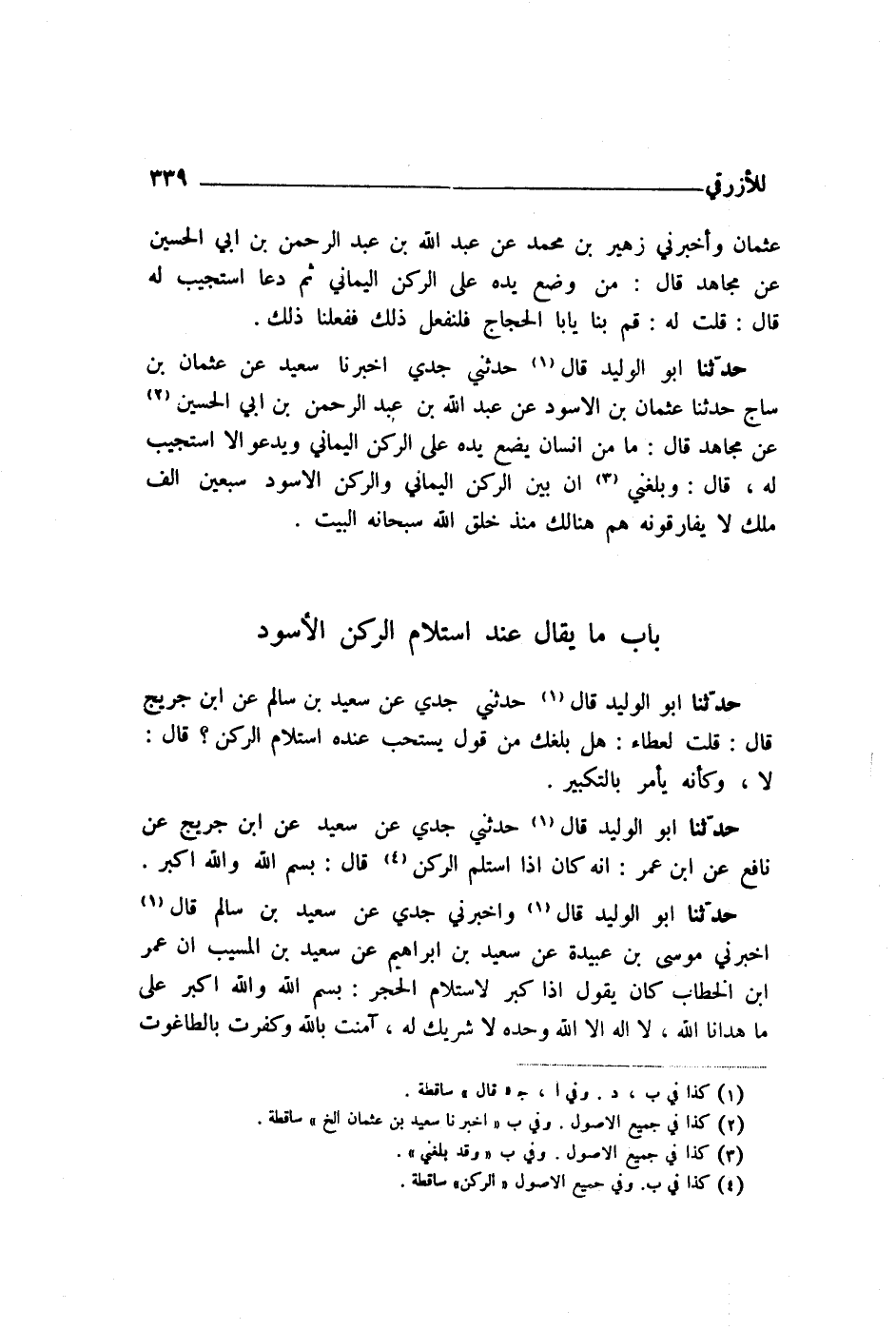 حَدَّثَنَا أَبُو الْوَلِيدِ قَالَ: وَأَخْبَرَنِي جَدِّي، عَنْ سَعِيدِ بْنِ سَالِمٍ، قَالَ: أَخْبَرَنِي مُوسَى بْنُ عُبَيْدَةَ، عَنْ سَعْدِ بْنِ إِبْرَاهِيمَ، عَنْ سَعِيدِ بْنِ الْمُسَيِّبِ، أَنَّ عُمَرَ بْنَ الْخَطَّابِ، كَانَ يَقُولُ §إِذَا كَبَّرَ لِاسْتِلَامِ الْحَجَرِ: بِسْمِ اللَّهِ، وَاللَّهُ أَكْبَرُ، عَلَى مَا هَدَانَا اللَّهُ، لَا إِلَهَ إِلَّا اللَّهُ، وَحْدَهُ لَا شَرِيكَ لَهُ، آمَنْتُ بِاللَّهِ، وَكَفَرْتُ بِالطَّاغُوتِ -[340]- وَبِاللَّاتِ وَالْعُزَّى وَمَا يُدْعَى مِنْ دُونِ اللَّهِ، إِنَّ وَلِيِّيَ اللَّهُ الَّذِي نَزَّلَ الْكِتَابَ وَهُوَ يَتَوَلَّى الصَّالِحِينَ " قَالَ عُثْمَانُ: بَلَغَنِي أَنَّهُ يُسْتَحَبُّ أَنْ يُقَالَ عِنْدَ اسْتِلَامِ الرُّكْنِ: بِسْمِ اللَّهِ، وَاللَّهُ أَكْبَرُ، اللَّهُمَّ إِيمَانًا بِكَ، وَتَصْدِيقًا بِمَا جَاءَ بِهِ مُحَمَّدٌ رَسُولُ اللَّهِ صَلَّى اللهُ عَلَيْهِ وَسَلَّمَ