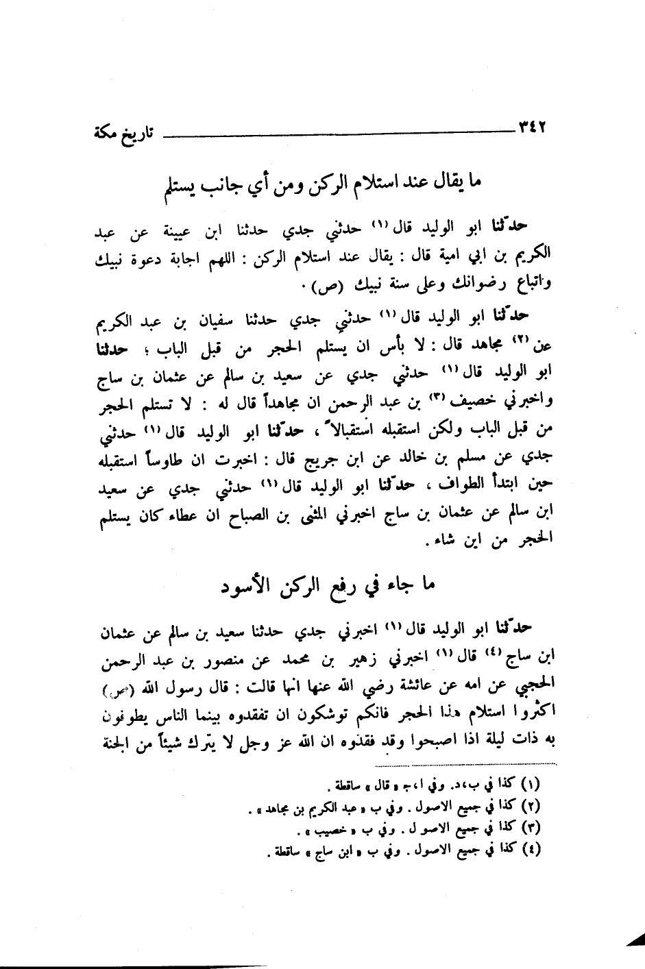 حَدَّثَنَا أَبُو الْوَلِيدِ قَالَ: حَدَّثَنِي جَدِّي، عَنْ سَعِيدِ بْنِ سَالِمٍ، عَنْ عُثْمَانَ بْنِ سَاجٍ، أَخْبَرَنِي الْمُثَنَّى بْنُ الصَّبَّاحِ أَنَّ عَطَاءً «كَانَ §يَسْتَلِمُ الْحَجَرَ مِنْ أَيْنَ شَاءَ»