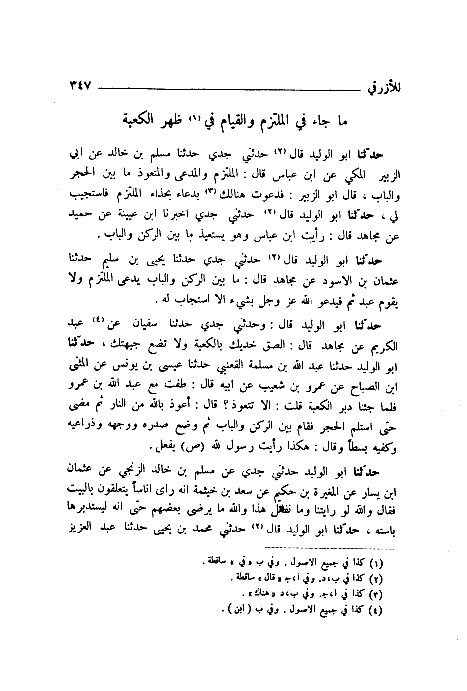 حَدَّثَنَا أَبُو الْوَلِيدِ قَالَ: حَدَّثَنِي جَدِّي، أَخْبَرَنَا ابْنُ عُيَيْنَةَ، عَنْ حُمَيْدٍ، عَنْ مُجَاهِدٍ، قَالَ: «رَأَيْتُ ابْنَ عَبَّاسٍ وَهُوَ §يَسْتَعِيذُ مَا بَيْنَ الرُّكْنِ وَالْبَابِ»