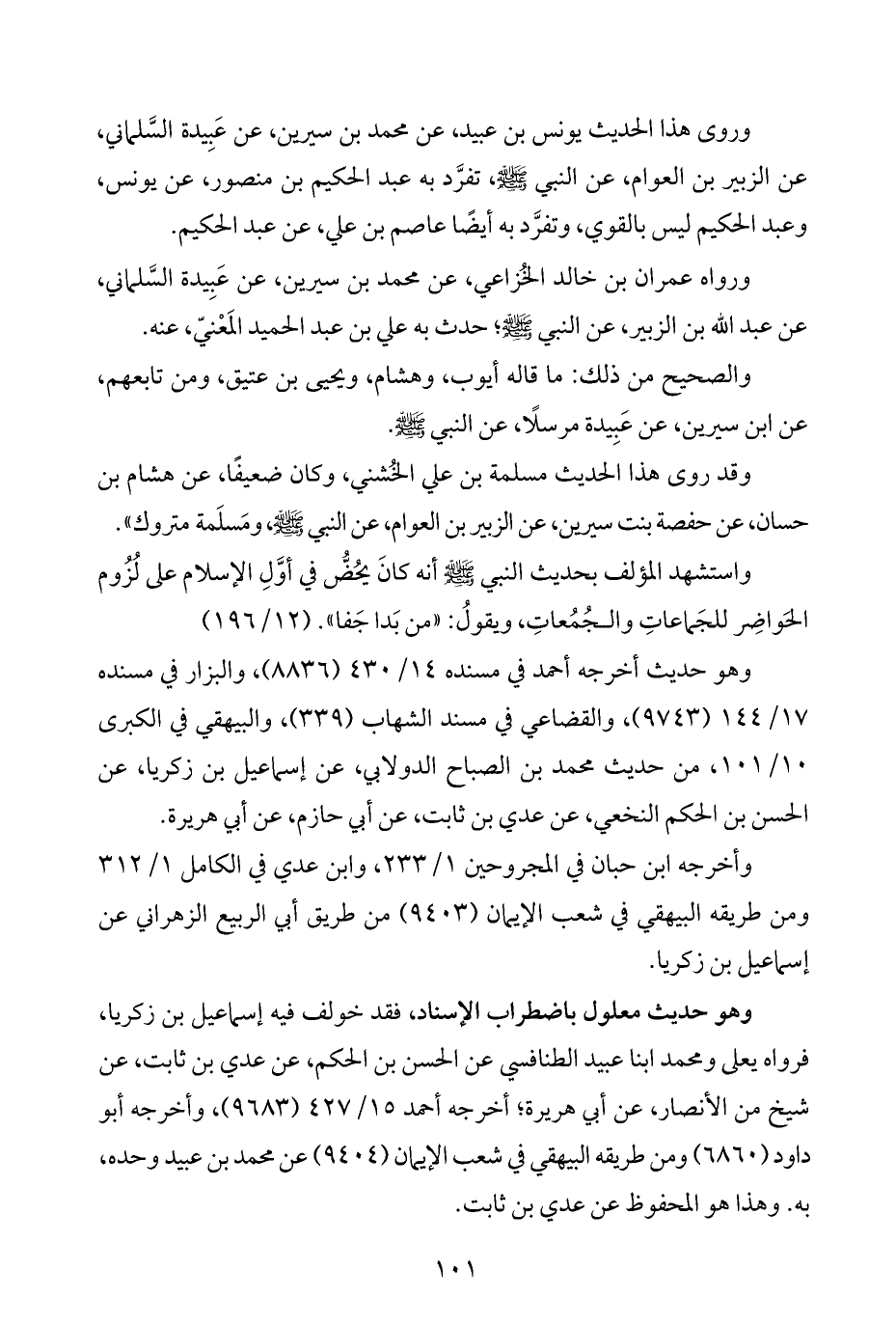 وروى هذا الحديث يونس بن عبيد، عن محمد بن سيرين، عن عَبِيدة السَّلماني، عن الزبير بن العوام، عن النبي -صلى اللَّه عليه وسلم-، تفرَّد به عبد الحكيم بن منصور، عن يونس، وعبد الحكيم ليس بالقوي، وتفرَّد به أيضًا عاصم بن علي، عن عبد الحكيم.