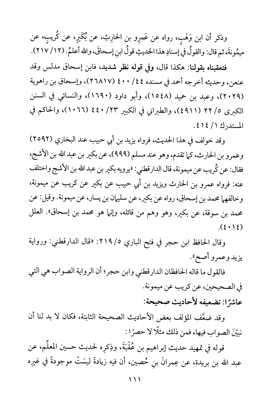 وذكر أن ابن وَهْبٍ، رواه عن عَمرِو بن الحارِثِ، عن بُكَيرٍ، عن كُريبٍ، عن ميمُونةَ، ثم قال: والقولُ في إسنادِ هذا الحديثِ قولُ ابنِ إسحاقَ، واللَّه أعلمُ. (١٢/ ٢١٧).