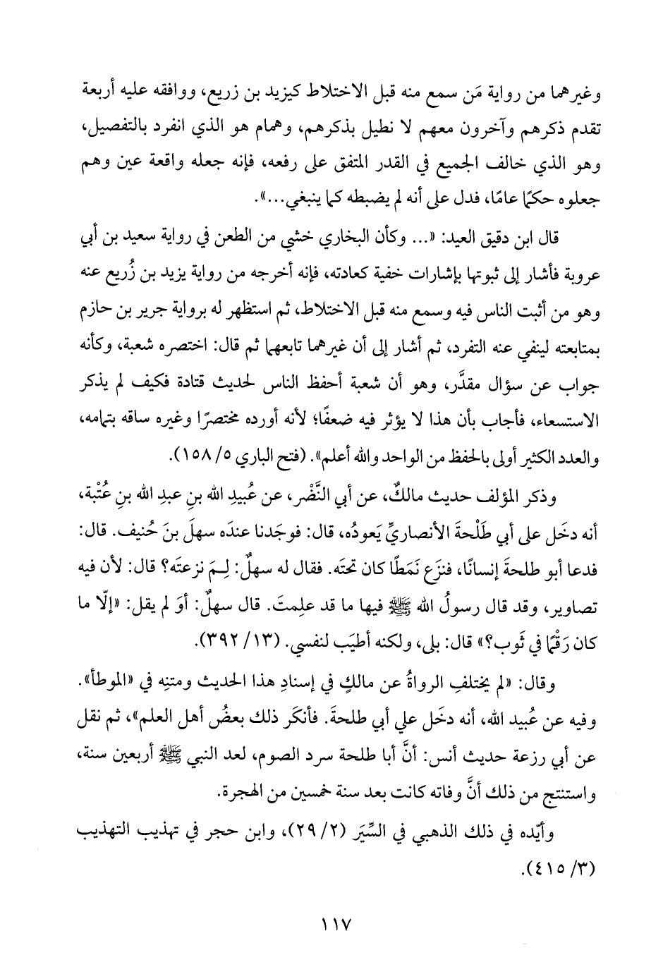 وقال: "لم يختلفِ الرواةُ عن مالكٍ في إسنادِ هذا الحديث ومتنِه في "الموطأ". وفيه عن عُبيد اللَّه، أنه دخَل علي أبي طلحةَ. فأنكَر ذلك بعضُ أهل العلم"، ثم نقل عن أبي رزعة حديث أنس: أنَّ أبا طلحة سرد الصوم، لعد النبي -صلى اللَّه عليه وسلم- أربعين سنة، واستنتج من ذلك أنَّ وفاته كانت بعد سنة خمسين من الهجرة.