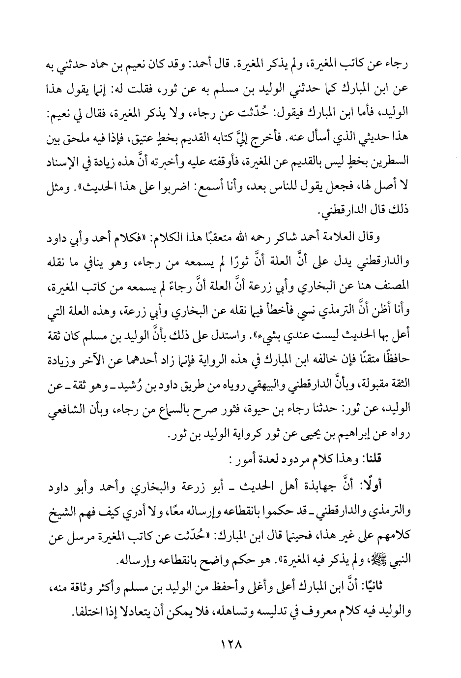 رجاء عن كاتب المغيرة، ولم يذكر المغيرة. قال أحمد: وقد كان نعيم بن حماد حدثني به عن ابن المبارك كما حدثني الوليد بن مسلم به عن ثور، فقلت له: إنما يقول هذا الوليد، فأما ابن المبارك فيقول: حُدّثت عن رجاء، ولا يذكر المغيرة، فقال لي نعيم: هذا حديثي الذي أسأل عنه. فأخرج إليَّ كتابه القديم بخطٍ عتيق، فإذا فيه ملحق بين السطرين بخطٍ ليس بالقديم عن المغيرة، فأوقفته عليه وأخبرته أنَّ هذه زيادة في الإسناد لا أصل لها، فجعل يقول للناس بعد، وأنا أسمع: اضربوا على هذا الحديث". ومثل ذلك قال الدارقطني.