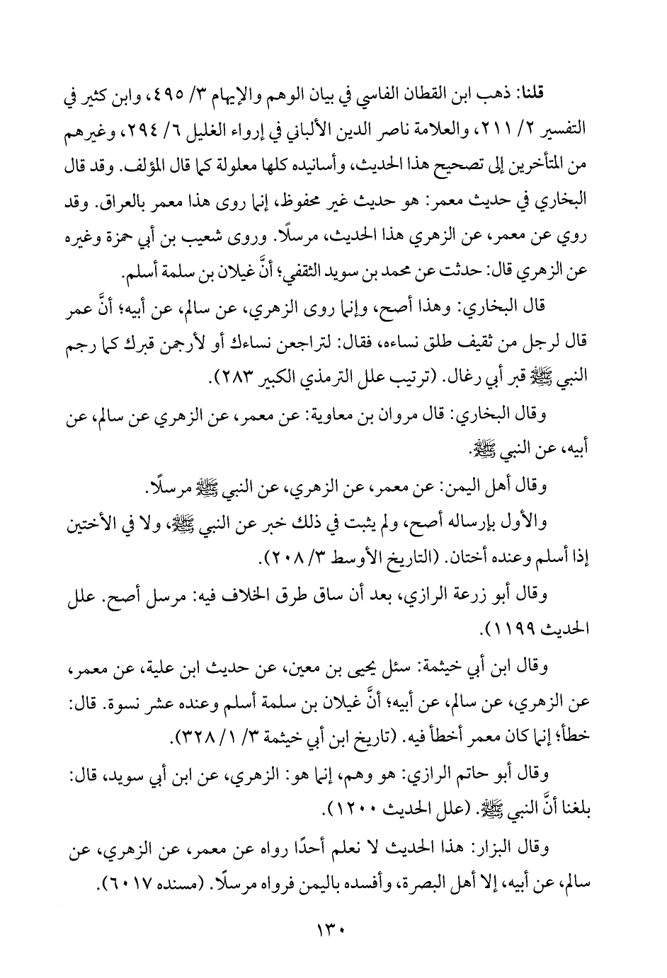 قلنا: ذهب ابن القطان الفاسي في بيان الوهم والإيهام ٣/ ٤٩٥، وابن كثير في التفسير ٢/ ٢١١، والعلامة ناصر الدين الألباني في إرواء الغليل ٦/ ٢٩٤، وغيرهم من المتأخرين إلى تصحيح هذا الحديث، وأسانيده كلها معلولة كما قال المؤلف. وقد قال البخاري في حديث معمر: هو حديث غير محفوظ، إنما روى هذا معمر بالعراق. وقد روي عن معمر، عن الزهري هذا الحديث، مرسلًا. وروى شعيب بن أبي حمزة وغيره عن الزهري قال: حدثت عن محمد بن سويد الثقفي، أنَّ غيلان بن سلمة أسلم.