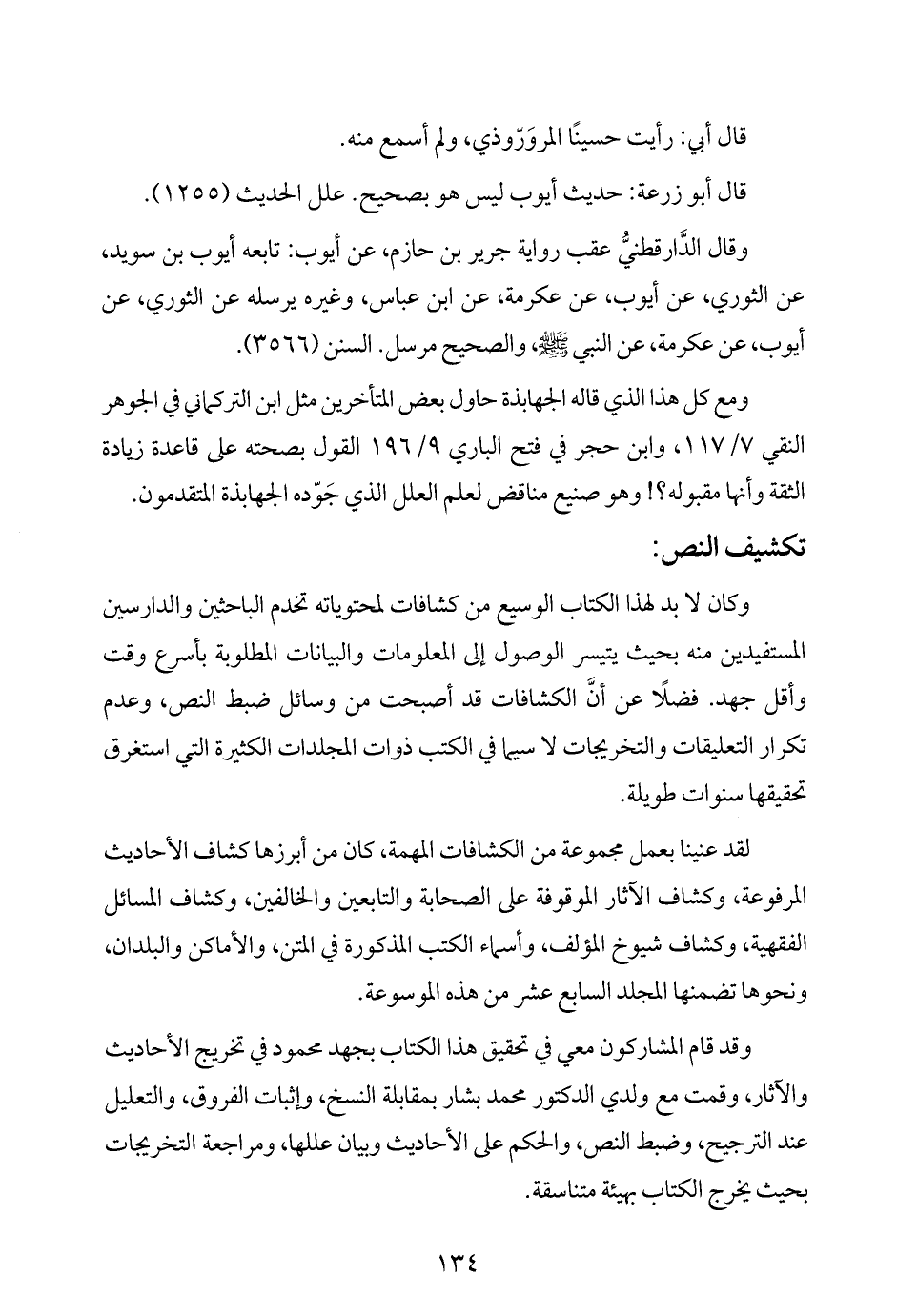 وقد قام المشاركون معي في تحقيق هذا الكتاب بجهد محمود في تخريج الأحاديث والاثار، وقمت مع ولدي الدكتور محمد بشار بمقابلة النسخ، وإثبات الفروق، والتعليل عند الترجيح، وضبط النص، والحكم على الأحاديث وبيان عللها، ومراجعة التخريجات بحيث يخرج الكتاب بهيئة متناسقة.
