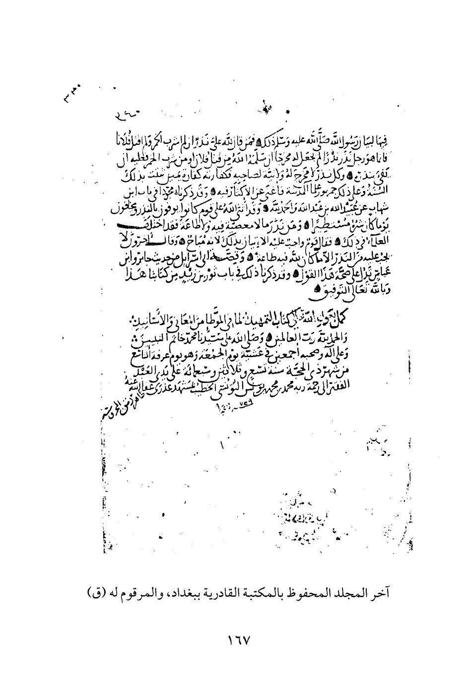 آخر المجلد المحفوظ بالمكتبة القادرية ببغداد، والمرقوم له (ق)