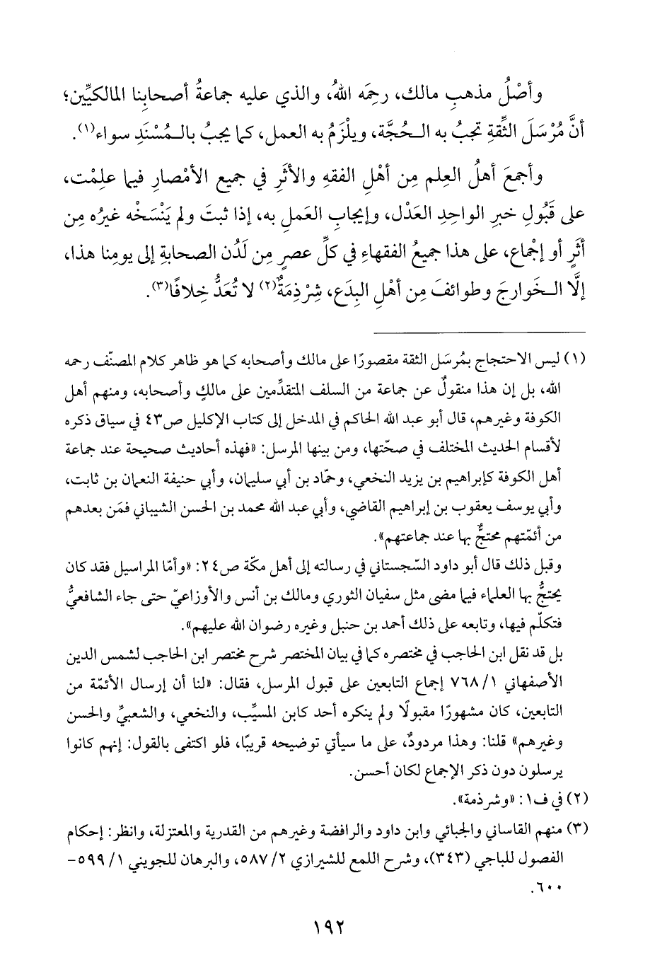 (¬١) ليس الاحتجاج بمُرسَل الثقة مقصورًا على مالك وأصحابه كما هو ظاهر كلام المصنّف رحمه اللَّه، بل إن هذا منقولٌ عن جماعة من السلف المتقدِّمين على مالكٍ وأصحابه، ومنهم أهل الكوفة وغيرهم، قال أبو عبد اللَّه الحاكم في المدخل إلى كتاب الإكليل ص ٤٣ في سياق ذكره لأقسام الحديث المختلف في صحّتها، ومن بينها المرسل: "فهذه أحاديث صحيحة عند جماعة أهل الكوفة كإبراهيم بن يزيد النخعي، وحمّاد بن أبي سليمان، وأبي حنيفة النعمان بن ثابت، وأبي يوسف يعقوب بن إبراهيم القاضي، وأبي عبد اللَّه محمد بن الحسن الشيباني فمَن بعدهم من أئمّتهم محتجٌّ بها عند جماعتهم".