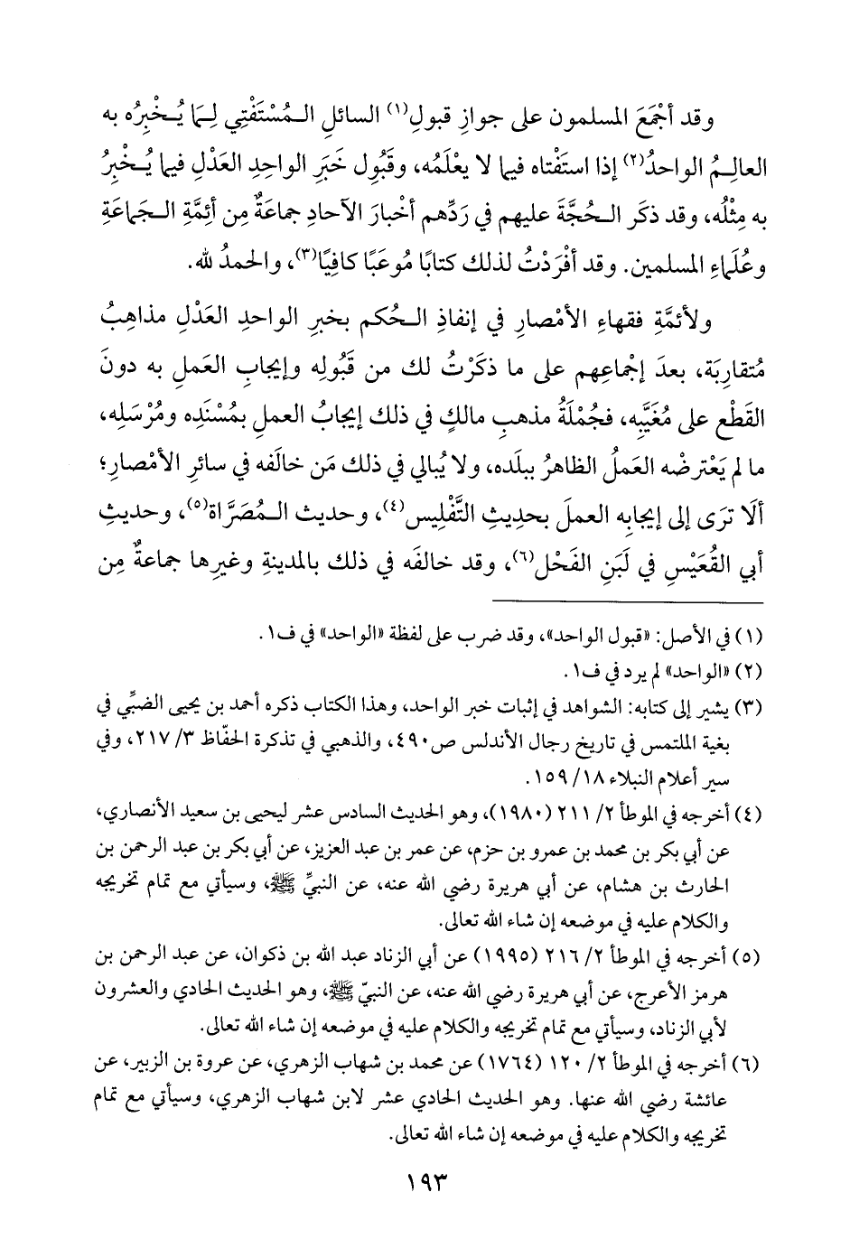 وقد أجْمَعَ المسلمون على جوازِ قبولِ (¬١) السائلِ المُسْتَفْتِي لِمَا يُخْبِرُه به العالِمُ الواحدُ (¬٢) إذا استَفْتاه فيما لا يعْلَمُه، وقَبُوِل خَبَرِ الواحِدِ العَدْلِ فيما يُخْبِرُ به مِثْلُه، وقد ذكَر الحُجَّةَ عليهم في رَدِّهم أخْبارَ الآحادِ جماعَةٌ مِن أئِمَّةِ الجَماعَةِ وعُلَماءِ المسلمين. وقد أفْرَدْتُ لذلك كتابًا مُوعَبًا كافِيًا (¬٣)، والحمدُ للَّه.