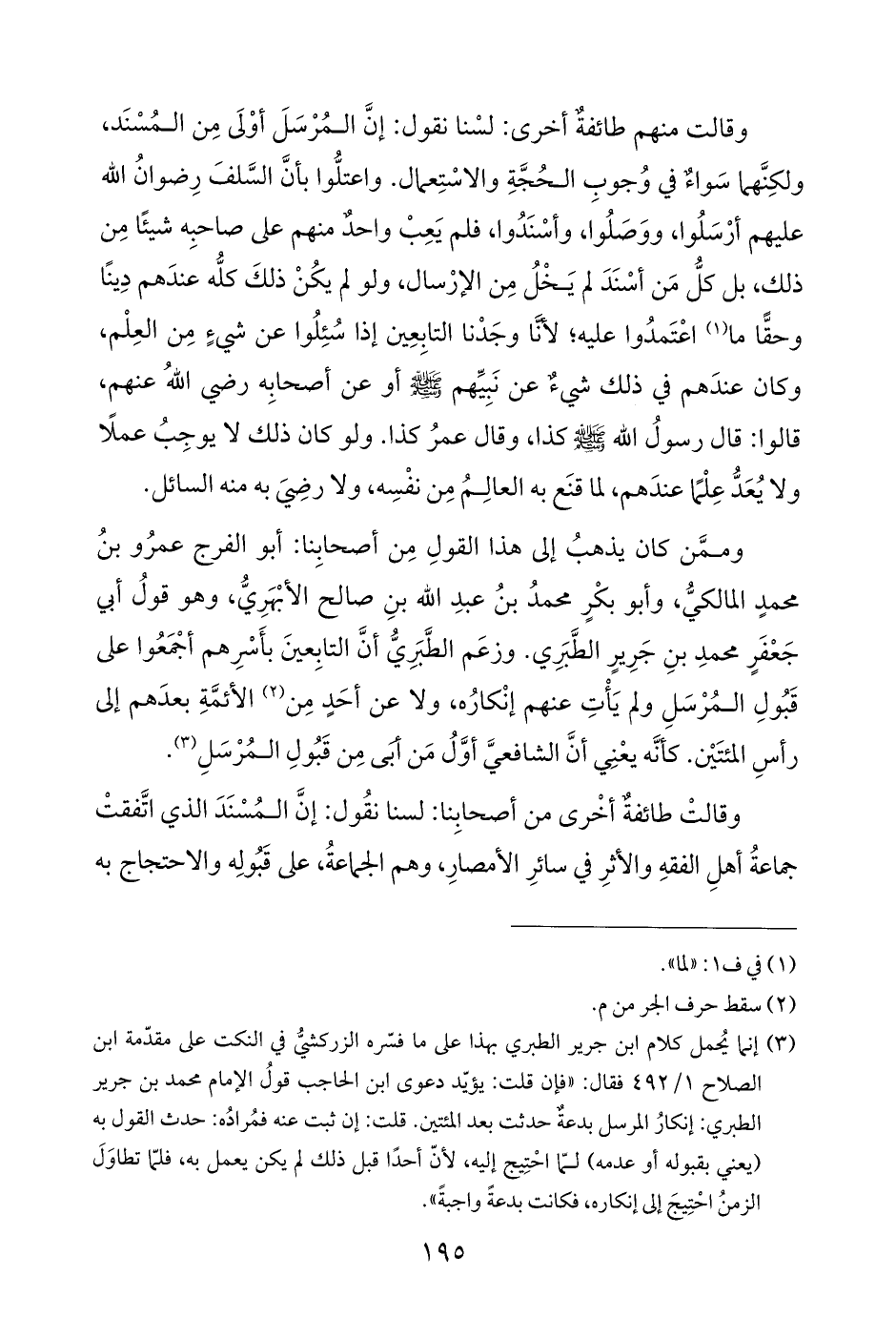 (¬٣) إنما يُحمل كلام ابن جرير الطبري بهذا على ما فسّره الزركشيُّ في النكت على مقدّمة ابن الصلاح ١/ ٤٩٢ فقال: "فإن قلت: يؤيّد دعوى ابن الحاجب قولُ الإمام محمد بن جرير الطبري: إنكارُ المرسل بدعةٌ حدثت بعد المئتين. قلت: إن ثبت عنه فمُرادُه: حدث القول به (يعني بقبوله أو عدمه) لمّا احْتِيج إليه، لأنّ أحدًا قبل ذلك لم يكن يعمل به، فلمّا تطاوَلَ الزمنُ احْتِيجَ إلى إنكاره، فكانت بدعةً واجبةً".