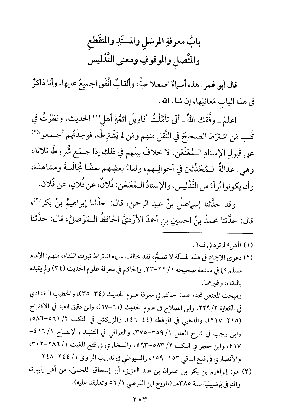 بابُ معرفةِ المرسَلِ والمسنَدِ والمنقَطعِ والمتَّصلِ والموقوفِ ومعنى التَّدْليس