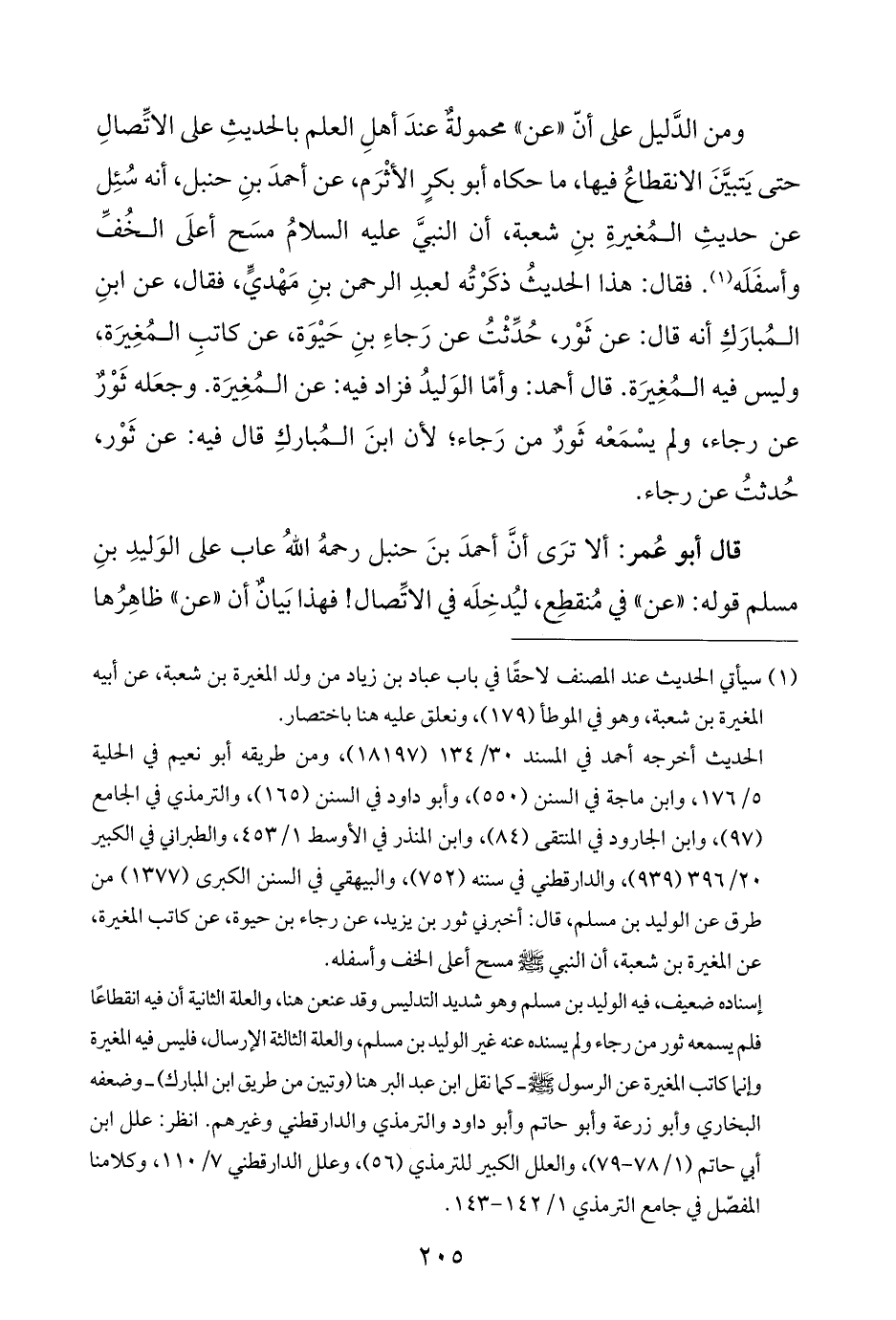 ومن الدَّليل على أنّ "عن" محمولةٌ عندَ أهلِ العلم بالحديثِ على الاتِّصالِ حتى يَتبيَّنَ الانقطاعُ فيها، ما حكاه أبو بكرٍ الأثْرَم، عن أحمدَ بنِ حنبل، أنه سُئِل عن حديثِ المُغيرةِ بنِ شعبة، أن النبيَّ عليه السلامُ مسَح أعلَى الخُفِّ وأسفَلَه (¬١). فقال: هذا الحديثُ ذكَرْتُه لعبدِ الرحمن بنِ مَهْديٍّ، فقال، عن ابنِ المُبارَكِ أنه قال: عن ثَوْر، حُدِّثْتُ عن رَجاءِ بنِ حَيْوَة، عن كاتبِ المُغِيرَة، وليس فيه المُغِيرَة. قال أحمد: وأمَّا الوَليدُ فزاد فيه: عن المُغِيرَة. وجعَله ثَوْرٌ عن رجاء، ولم يسْمَعْه ثَورٌ من رَجاء؛ لأن ابنَ المُباركِ قال فيه: عن ثَوْر، حُدثتُ عن رجاء.