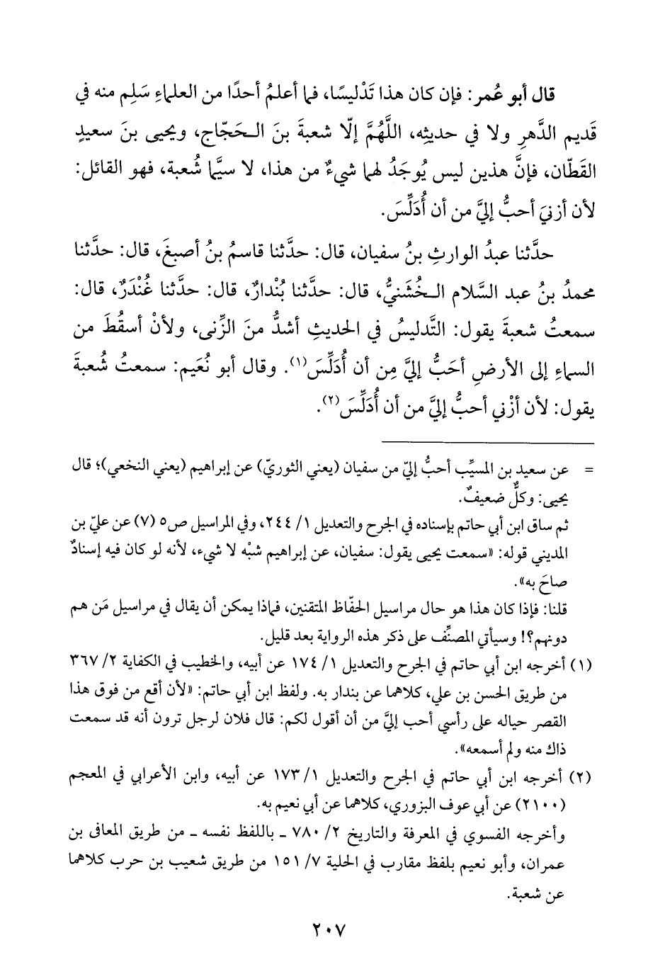 حدَّثنا عبدُ الوارثِ بنُ سفيان، قال: حدَّثنا قاسمُ بنُ أصبغَ، قال: حدَّثنا محمدُ بنُ عبد السَّلام الخُشَنيُّ، قال: حدَّثنا بُنْدارٌ، قال: حدَّثنا غُنْدَرٌ، قال: سمعتُ شعبةَ يقول: التَّدليسُ في الحديثِ أشدُّ منَ الزِّنى، ولأنْ أسقُطَ من السماءِ إلى الأرضِ أحَبُّ إليَّ مِن أن أُدَلِّسَ (¬١). وقال أبو نُعَيم: سمعتُ شُعبةَ يقول: لأن أزْني أحبُّ إليَّ من أن أُدَلِّسَ (¬٢).