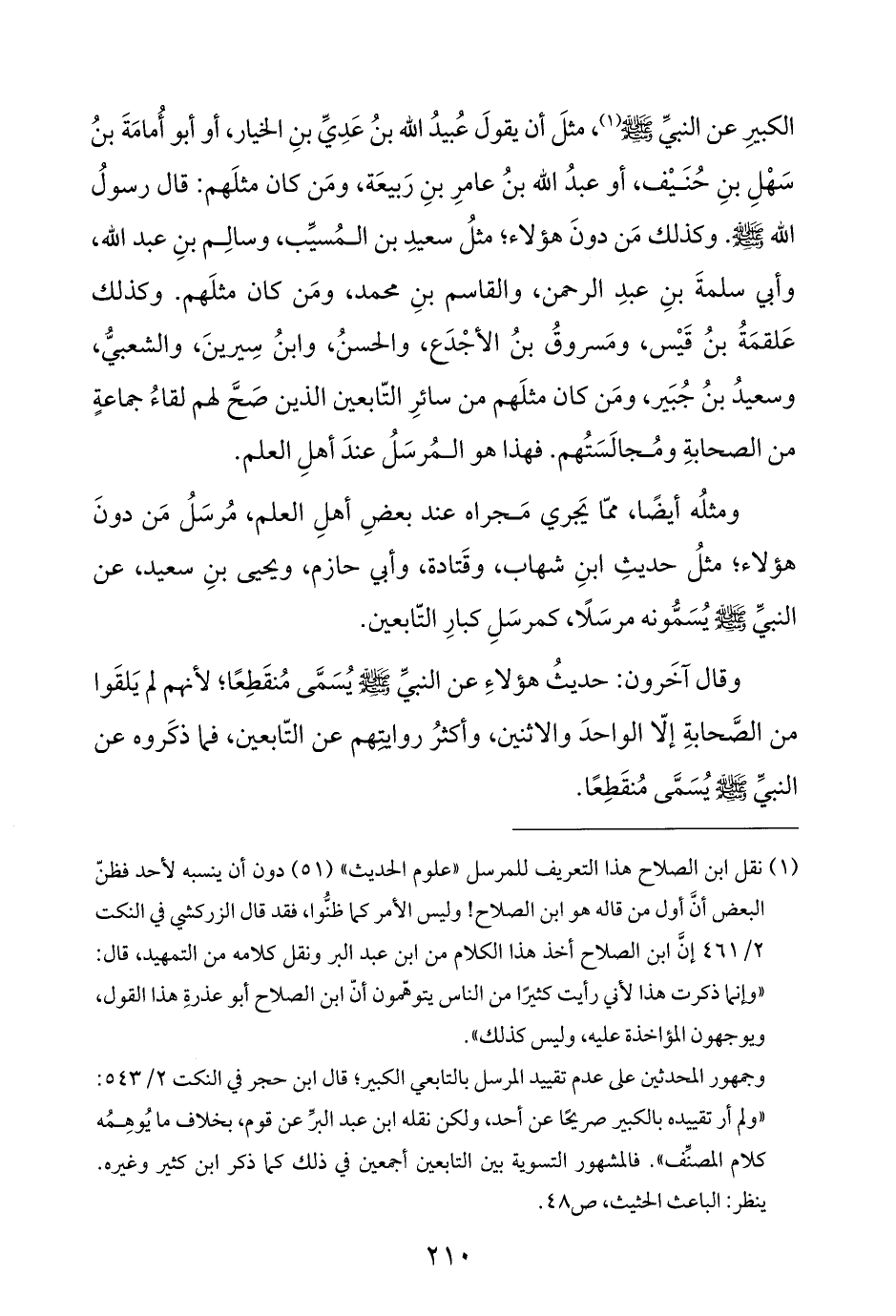 (¬١) نقل ابن الصلاح هذا التعريف للمرسل "علوم الحديث" (٥١) دون أن ينسبه لأحد فظنّ البعض أنَّ أول من قاله هو ابن الصلاح! وليس الأمر كما ظنُّوا، فقد قال الزركشي في النكت ٢/ ٤٦١ إنَّ ابن الصلاح أخذ هذا الكلام من ابن عبد البر ونقل كلامه من التمهيد، قال: "وإنما ذكرت هذا لأني رأيت كثيرًا من الناس يتوهّمون أنّ ابن الصلاح أبو عذرةِ هذا القول، ويوجهون المؤاخذة عليه، وليس كذلك".