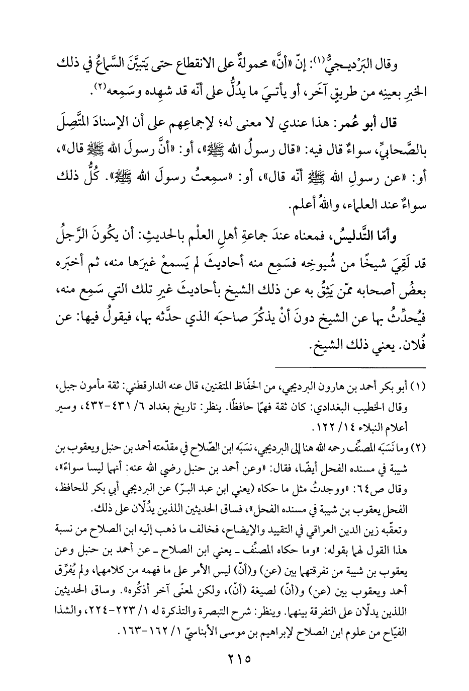 وقال البَرْديجيُّ (¬١): إنّ "أنَّ" محمولةٌ على الانقطاع حتى يَتبيَّنَ السَّماعُ في ذلك الخبرِ بعينِه من طريقٍ آخَر، أو يأتيَ ما يدُلُّ على أَنَّه قد شهِده وسَمِعه (¬٢).