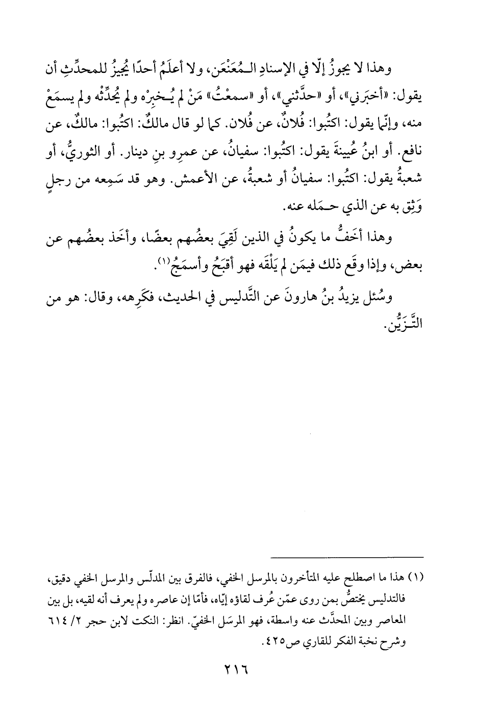 وهذا لا يجوزُ إلّا في الإسنادِ المُعَنْعَن، ولا أعلَمُ أحدًا يُجيزُ للمحدِّثِ أن يقول: "أخبَرني"، أو "حدَّثني"، أو "سمعْتُ" مَنْ لم يُخبِرْه ولم يُحدِّثْه ولم يسمَعْ منه، وإنَّما يقول: اكتُبوا: فُلانٌ، عن فُلان. كما لو قال مالك: اكتُبوا: مالكٌ، عن نافع. أو ابنُ عُيينةَ يقول: اكتُبوا: سفيانُ، عن عمرِو بنِ دينار. أو الثوريُّ، أو شعبةُ يقول: اكتُبوا: سفيانُ أو شعبةُ، عن الأعمش. وهو قد سَمِعه من رجلٍ وَثِق به عن الذي حمَله عنه.