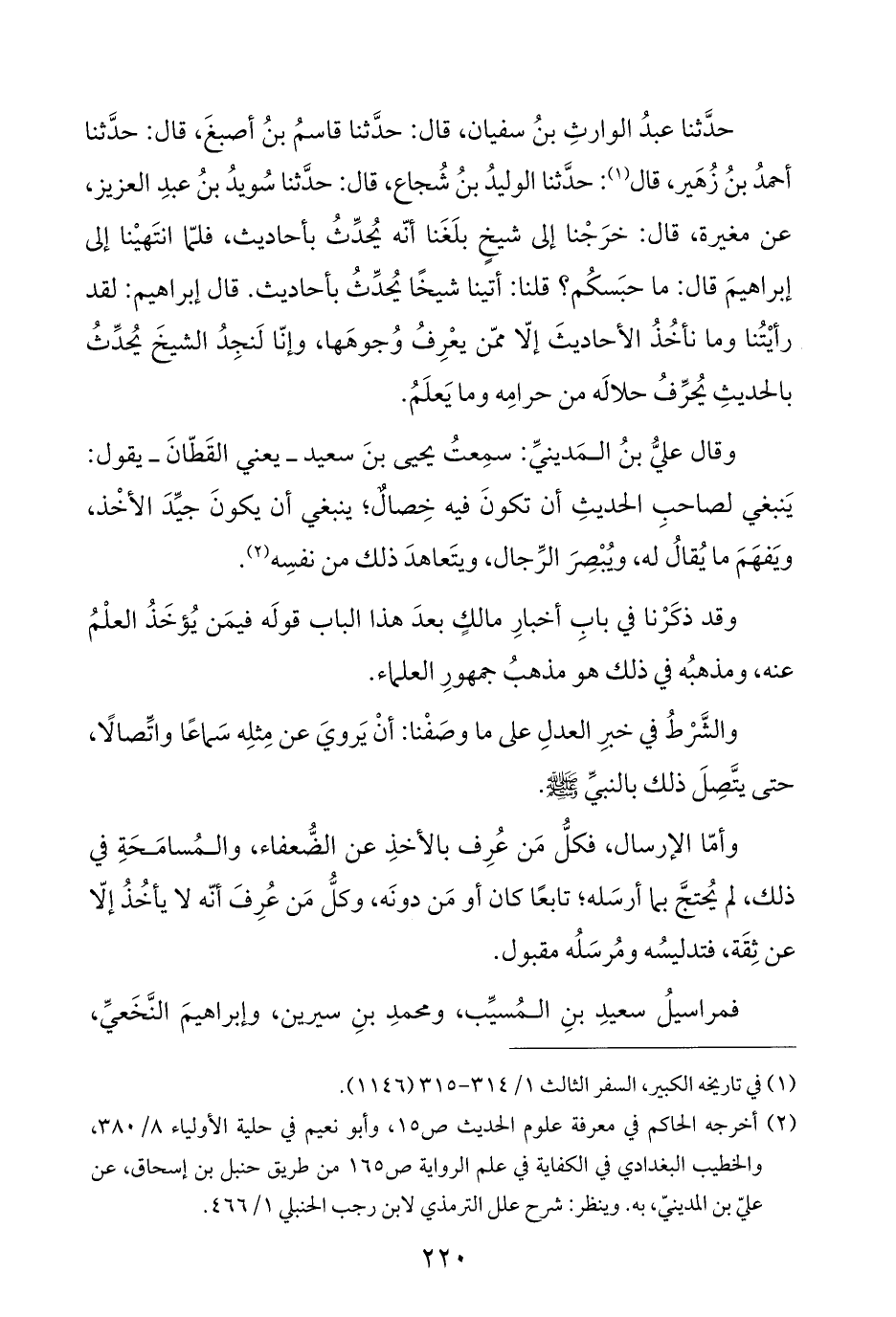 (¬٢) أخرجه الحاكم في معرفة علوم الحديث ص ١٥، وأبو نعيم في حلية الأولياء ٨/ ٣٨٠، والخطيب البغدادي في الكفاية في علم الرواية ص ١٦٥ من طريق حنبل بن إسحاق، عن علي بن المدينيّ، به. وينظر: شرح علل الترمذي لابن رجب الحنبلي ١/ ٤٦٦.