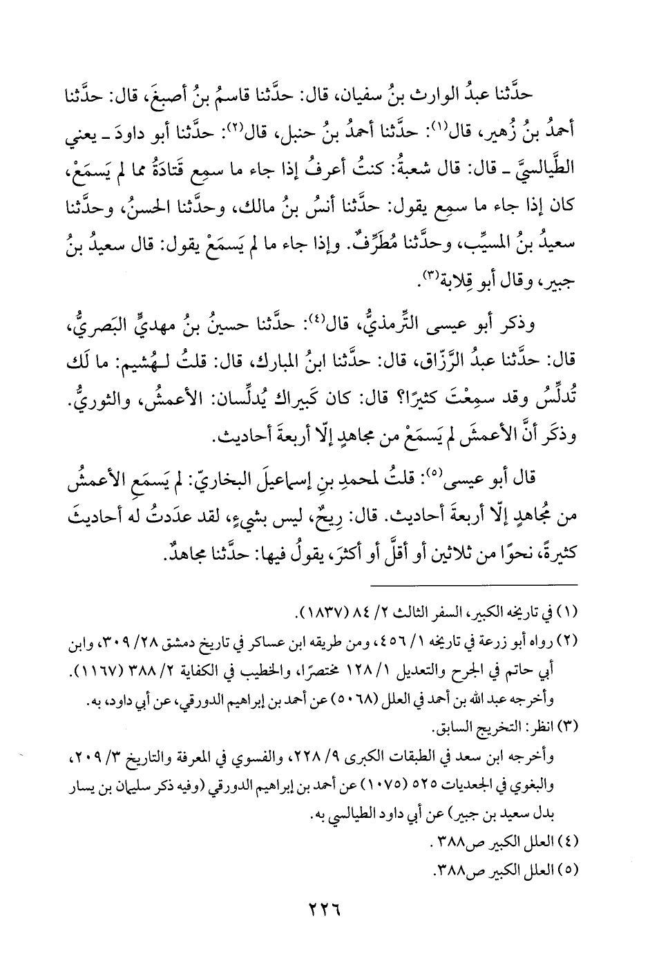 وذكر أبو عيسى التِّرمذيُّ، قال (¬٤): حدَّثنا حسينُ بنُ مهديٍّ البَصريُّ، قال: حدَّثنا عبدُ الرَّزّاق، قال: حدَّثنا ابنُ المبارك، قال: قلتُ لهُشيم: ما لَك تُدلِّسُ وقد سمِعْتَ كثيرًا؟ قال: كان كَبيراك يُدلِّسان: الأعمشُ، والثوريُّ. وذكَر أنَّ الأعمشَ لم يَسمَعْ من مجاهدٍ إلّا أربعةَ أحاديث.