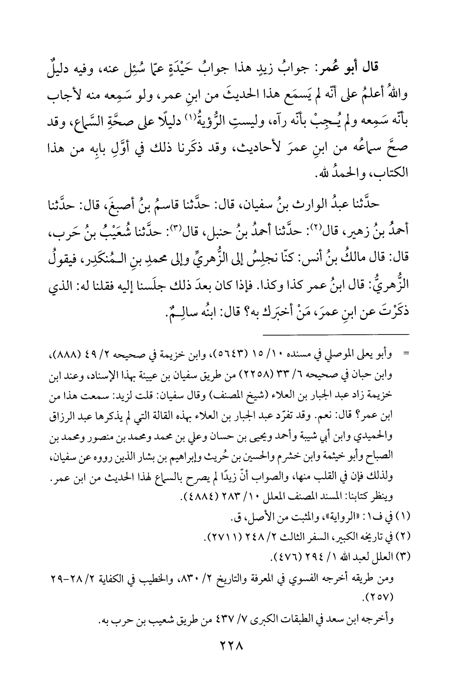 حدَّثنا عبدُ الوارث بنُ سفيان، قال: حدَّثنا قاسمُ بنُ أصبغَ، قال: حدَّثنا أحمدُ بنُ زهير، قال (¬٢): حدَّثنا أحمدُ بنُ حنبل، قال (¬٣): حدَّثنا شُعَيْبُ بنُ حَرب، قال: قال مالكُ بنُ أنس: كنّا نجلِسُ إلى الزُّهريِّ وإلى محمدِ بنِ المُنكَدِر، فيقولُ الزُّهريُّ: قال ابنُ عمر كذا وكذا. فإذا كان بعدَ ذلك جلَسنا إليه فقلنا له: الذي ذكَرْتَ عن ابنِ عمرَ، مَنْ أخبَرك به؟ قال: ابنُه سالِمٌ.