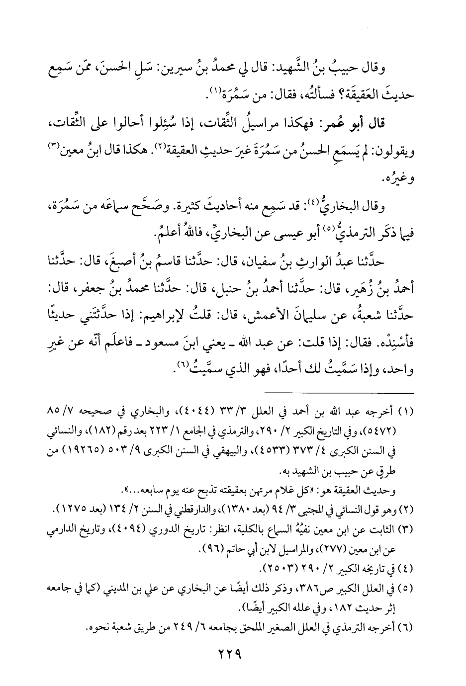 (¬١) أخرجه عبد اللَّه بن أحمد في العلل ٣/ ٣٣ (٤٠٤٤)، والبخاري في صحيحه ٧/ ٨٥ (٥٤٧٢)، وفي التاريخ الكبير ٢/ ٢٩٠، والترمذي في الجامع ١/ ٢٢٣ بعد رقم (١٨٢)، والنسائي في السنن الكبرى ٤/ ٣٧٣ (٤٥٣٣)، والبيهقي في السنن الكبرى ٩/ ٥٠٣ (١٩٢٦٥) من طرقٍ عن حبيب بن الشهيد به.