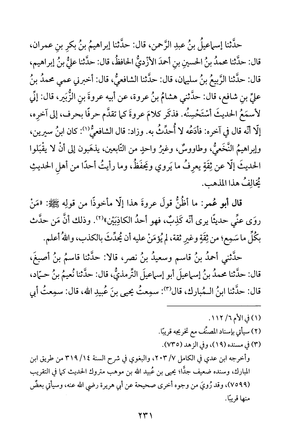 حدَّثنا إسماعيلُ بنُ عبدِ الرحمن، قال: حدَّثنا إبراهيمُ بنُ بكرِ بنِ عمران، قال: حدَّثنا محمدُ بنُ الحسينِ بنِ أحمدَ الأزْديُّ الحافظُ، قال: حدَّثنا عليُّ بنُ إبراهيم، قال: حدَّثنا الرَّبيعُ بنُ سليمان، قال: حدَّثنا الشافعيُّ، قال: أخبرني عمي محمدُ بنُ عليِّ بنِ شافع، قال: حدَّثني هشامُ بنُ عروة، عن أبيه عروةَ بنِ الزُّبَير، قال: إنِّي لأسمَعُ الحديثَ أسْتَحْسِنُه. فذكَر كلامَ عروةَ كما تقدَّم حرفًا بحرف، إلى آخرِه، إلّا أنّه قال في آخره: فأدَعُه لا أُحدِّثُ به. وزاد: قال الشافعيُّ (¬١): كان ابنُ سيرين، وإبراهيمُ النَّخَعيُّ، وطاووسٌ، وغيرُ واحدٍ من التّابعين، يذهَبون إلى أن لا يقْبَلوا الحديثَ إلّا عن ثِقَةٍ يعرِفُ ما يَروي ويَحفَظُ، وما رأيتُ أحدًا من أهلِ الحديثِ يُخالِفُ هذا المذهب.