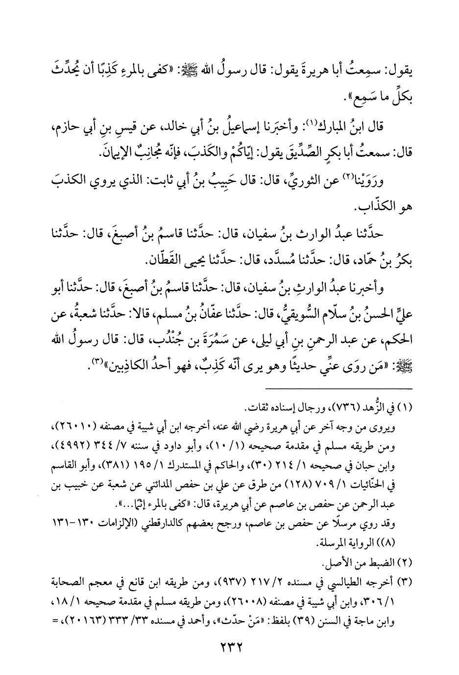 (¬٣) أخرجه الطيالسي في مسنده ٢/ ٢١٧ (٩٣٧)، ومن طريقه ابن قانع في معجم الصحابة ١/ ٣٠٦، وابن أبي شيبة في مصنفه (٢٦٠٠٨)، ومن طريقه مسلم في مقدمة صحيحه ١/ ١٨، وابن ماجة في السنن (٣٩) بلفظ: "مَنْ حدّث"، وأحمد في مسنده ٣٣/ ٣٣٣ (٢٠١٦٣)، =