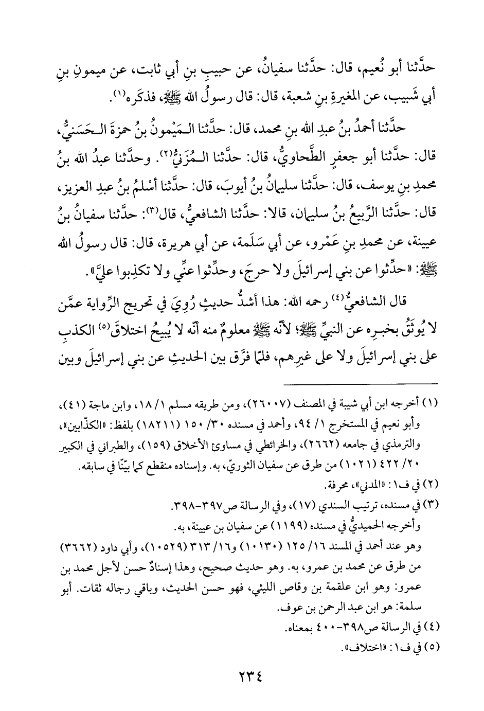 حدَّثنا أحمدُ بنُ عبدِ اللَّه بنِ محمد، قال: حدَّثنا المَيْمونُ بنُ حمزةَ الحَسَنيُّ، قال: حدَّثنا أبو جعفرٍ الطَّحاويُّ، قال: حدَّثنا المُزَنيُّ (¬٢). وحدَّثنا عبدُ اللَّه بنُ محمدِ بنِ يوسف، قال: حدَّثنا سليمانُ بنُ أيوبَ، قال: حدَّثنا أسْلمُ بنُ عبدِ العزيز، قال: حدَّثنا الرَّبيعُ بنُ سليمان، قالا: حدَّثنا الشافعيُّ، قال (¬٣): حدَّثنا سفيانُ بنُ عيينة، عن محمدِ بنِ عَمْرو، عن أبي سَلَمة، عن أبي هريرة، قال: قال رسولُ اللَّه -صلى اللَّه عليه وسلم-: "حدِّثوا عن بني إسرائيلَ ولا حرجَ، وحدِّثوا عنِّي ولا تكذِبوا عليَّ".