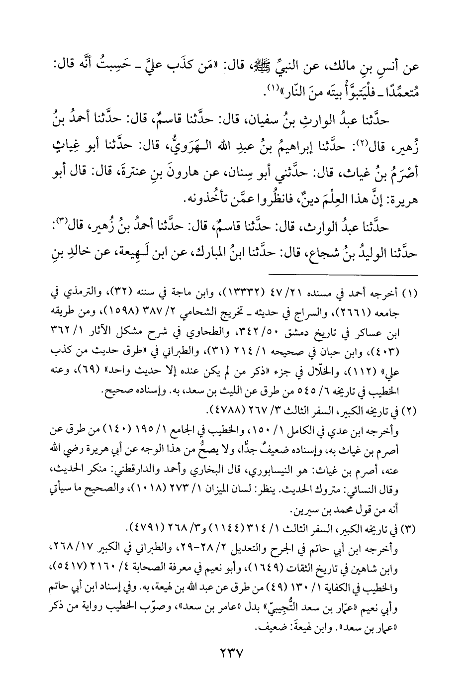 حدَّثنا عبدُ الوارثِ بنُ سفيان، قال: حدَّثنا قاسمٌ، قال: حدَّثنا أحمدُ بنُ زُهير، قال (¬٢): حدَّثنا إبراهيمُ بنُ عبدِ اللَّه الهَرَويُّ، قال: حدَّثنا أبو غِياثٍ أصْرَمُ بنُ غياث، قال: حدَّثني أبو سِنان، عن هارونَ بنِ عنترةَ، قال: قال أبو هريرة: إنَّ هذا العِلْمَ دينٌ، فانظُروا عمَّن تأخُذونه.
