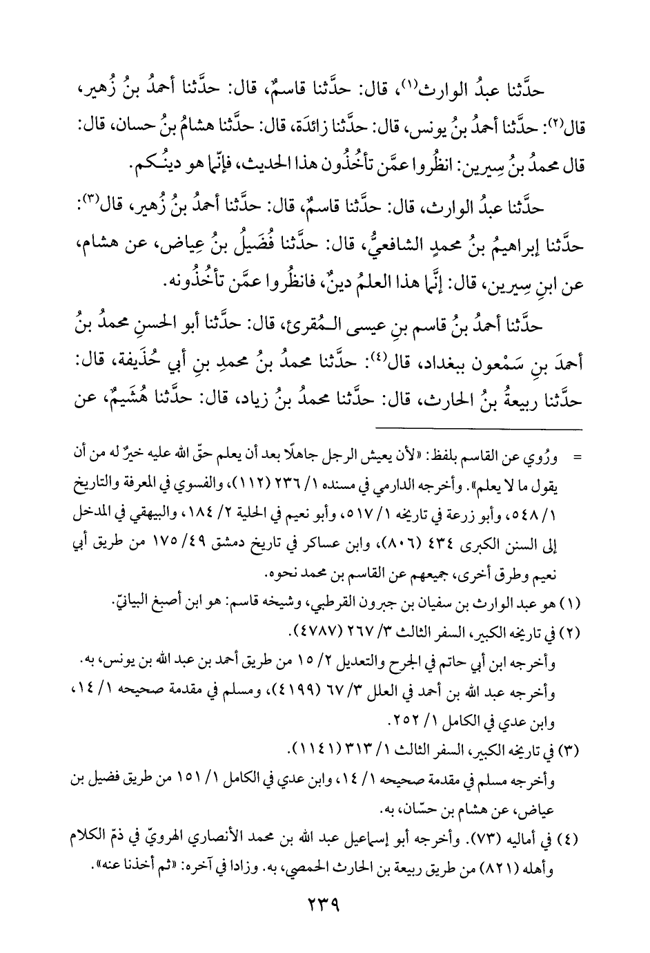 حدَّثنا عبدُ الوارث (¬١)، قال: حدَّثنا قاسمٌ، قال: حدَّثنا أحمدُ بنُ زُهير، قال (¬٢): حدَّثنا أحمدُ بنُ يونس، قال: حدَّثنا زائدَة، قال: حدَّثنا هشامُ بنُ حسان، قال: قال محمدُ بنُ سِيرين: انظُروا عمَّن تأخُذُون هذا الحديث، فإنّما هو دينُكم.