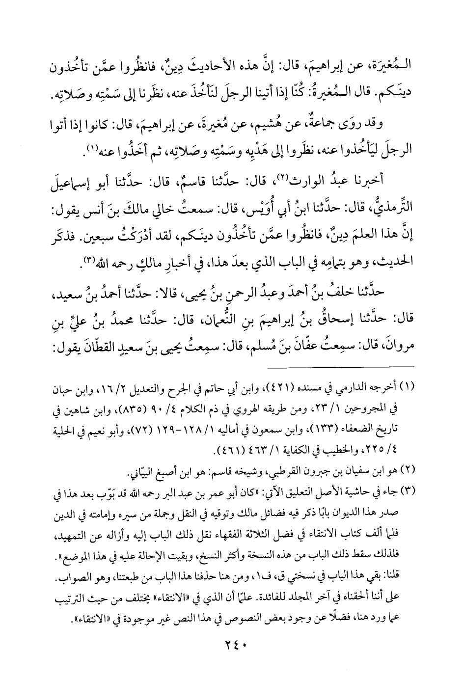 أخبرنا عبدُ الوارث (¬٢)، قال: حدَّثنا قاسمٌ، قال: حدَّثنا أبو إسماعيلَ التِّرمذيُّ، قال: حدَّثنا ابنُ أبي أُوَيْس، قال: سمعتُ خالي مالكَ بنَ أنس يقول: إنَّ هذا العلمَ دِينٌ، فانظُروا عمَّن تأخُذُون دينَكم، لقد أدْرَكْتُ سبعين. فذكَر الحديث، وهو بتمامِه في الباب الذي بعدَ هذا، في أخبارِ مالكٍ رحمه اللَّه (¬٣).